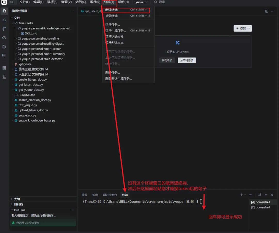官方教程写着 “一键安装”,可我连从哪个入口装都不知道。 我以为是粘贴到电脑终端,因为之前安装Python的库都是在终端粘贴的。实际上实在trae的终端窗口,没有的话新建一个。