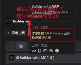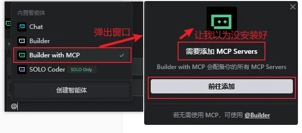 群里有人指出切换那个带MCP字眼的就行。于是就出现了另一些问题:切换MCP字眼的智能体,弹出对话框,让我以为没安装上插件。实际上,切换完事不用管这个对话框!!!