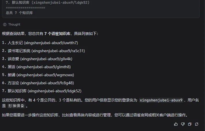 这时候我试着问 :“我的语雀知识库有几个?”哎,这个可能触发到了那个插件的关键词,所以它就开始运行了,最终给我显示对应的答案。