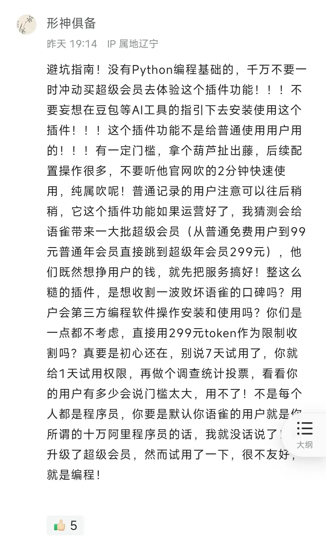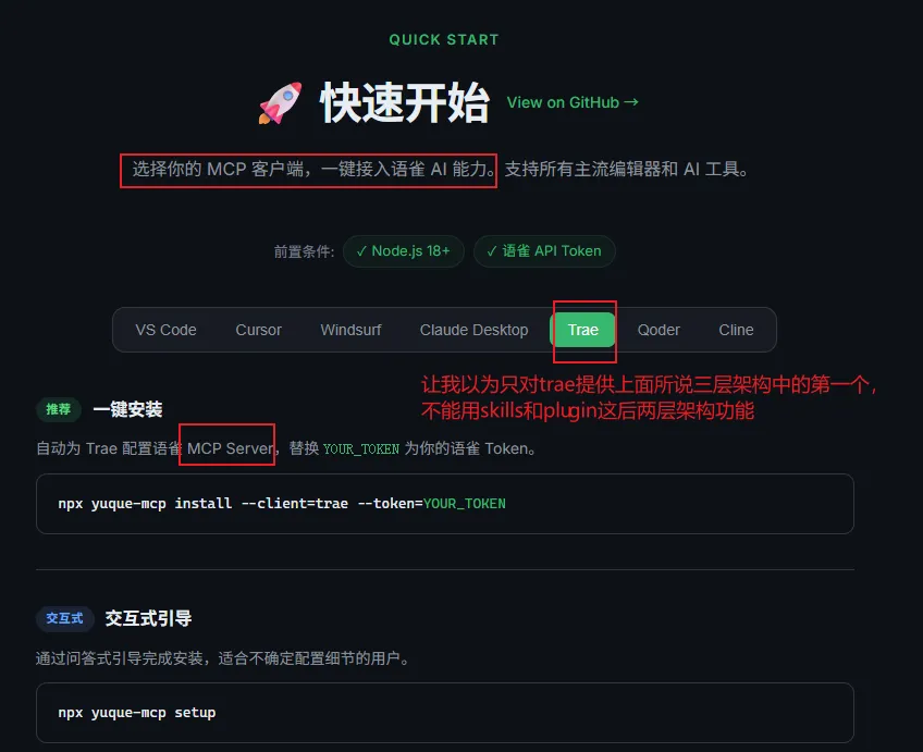 语雀插件教程的设计者,真的有想过有用户不会用这些第三方工具吗?trae 已经算相对简单的了,Claude Code 更是劝退一大片。官方还大篇幅推荐在这个软件里使用插件,注册问题、无法注册的替代方案、方案里的弯弯绕绕,全都没替用户考虑。