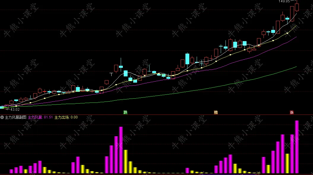 核心逻辑是通过计算价格波动与近期高低点的关系,捕捉主力动向。简单说就是”紫进黄出”,适合短线波段操作。紫色柱状图(主力风暴)表示主力进场,黄色柱状图(主力出场)表示主力离场。