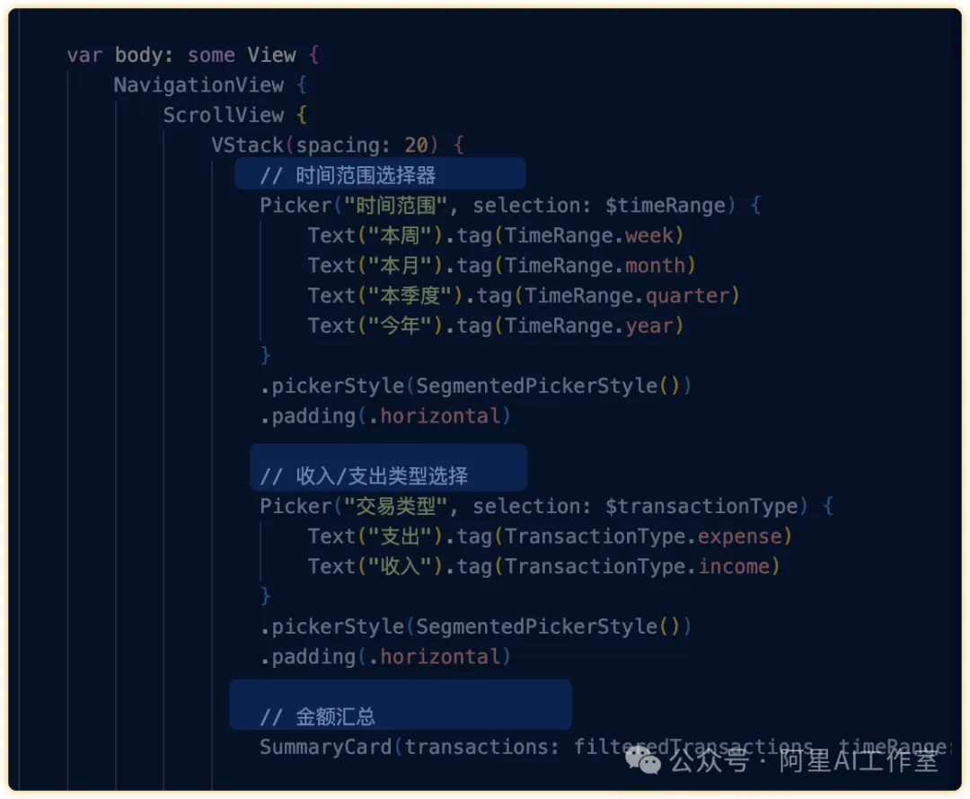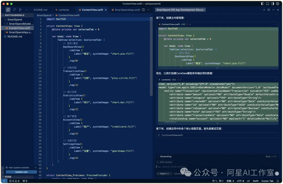 使用Swift语言,为我开发一款移动应用,它的功能介绍如下## 产品概述- 产品名称:SmartSpend- 功能概述:一款AI自动记账应用,通过智能识别消费记录和手动输入相结合的方式,帮助用户轻松管理个人财务- 应用平台:iOS设备## 核心功能模块### 1. 智能记账- 自动解析短信/邮件中的消费记录- 截图OCR识别账单内容- 智能分类(餐饮/购物/交通等)### 2. 手动记账- 快速记账表单(金额/分类/日期/备注/账户)- 常用模板保存- 周期性账单自动记录### 3. 数据可视化- 消费趋势图表(日/周/月)- 分类占比环形图- 预算进度提醒### 4. 账户管理- 多账户余额展示(现金/银行卡/电子钱包)- 账户间转账记录- 余额变动提醒