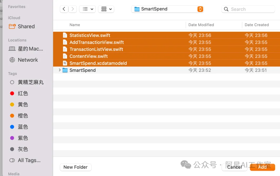 所以需要到Xcode里,右键点击您的项目导航栏中的SmartSpend文件夹。选择”Add Files to ‘SmartSpend’…”浏览到这些文件所在位置并选择它们导入。如图