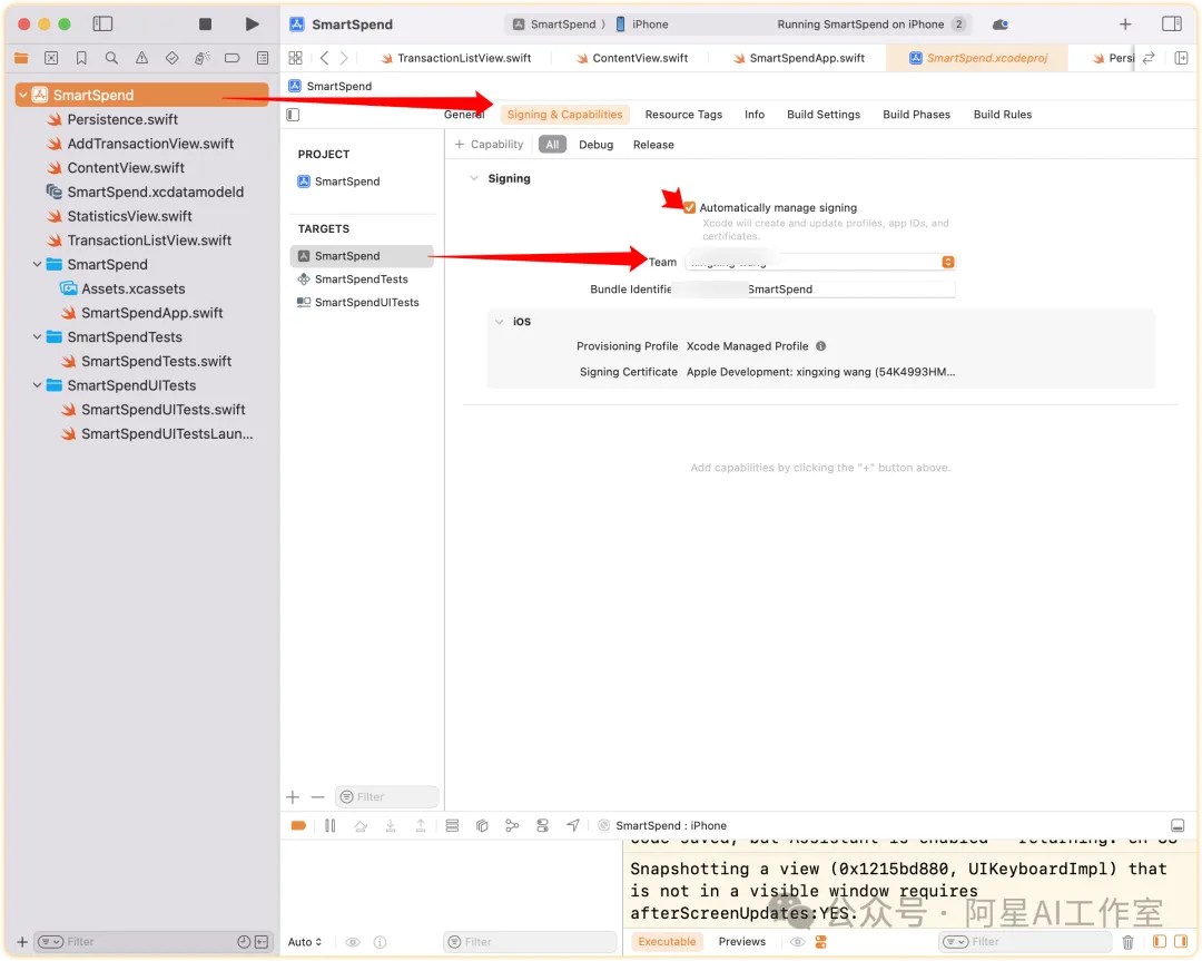 签名差不多就是认证的意思,选中项目target,注意看我画箭头的位置,别选成上面那个。选择你的team信息(这就是为什么之前需要注册)。