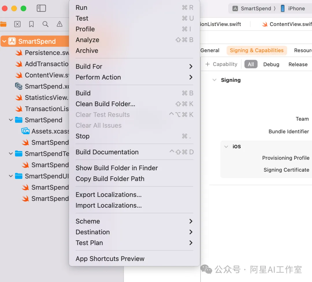 核心Swift文件:SmartSpendApp.swiftContentView.swiftTransactionListView.swiftAddTransactionView.swiftStatisticsView.swiftPersistence.swift资源和配置文件:Info.plistSmartSpend.xcdatamodeld Assets.xcassets
