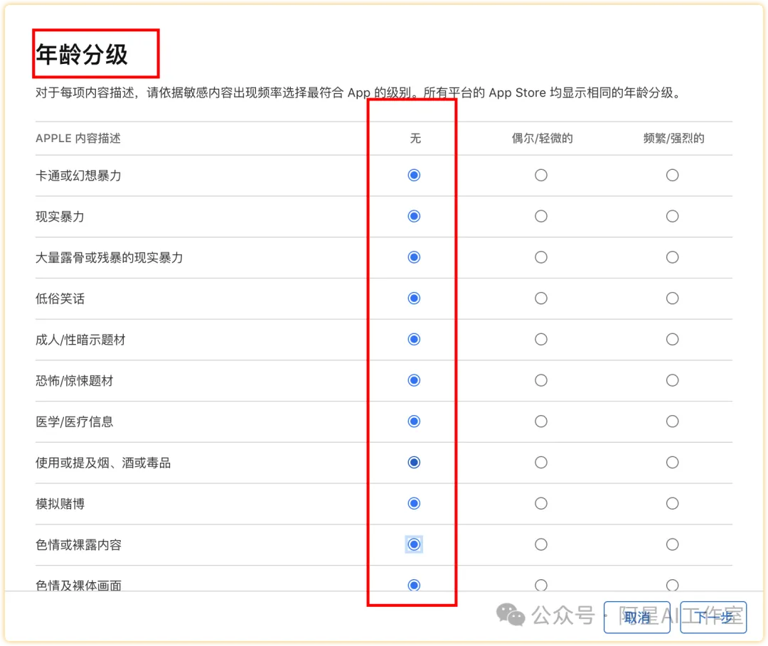 年龄分级都选nonono,最后会给你评定为4+