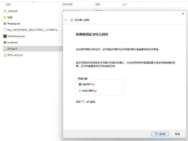 二、使用说明1、如果需要开启视频标题显示,那么需要注意:先点击开启标题显示,再打开缓存文件夹,安装证书.p12(一直点击下一步即可),重启一下软件,提示开启成功后,可以显示标题啦!