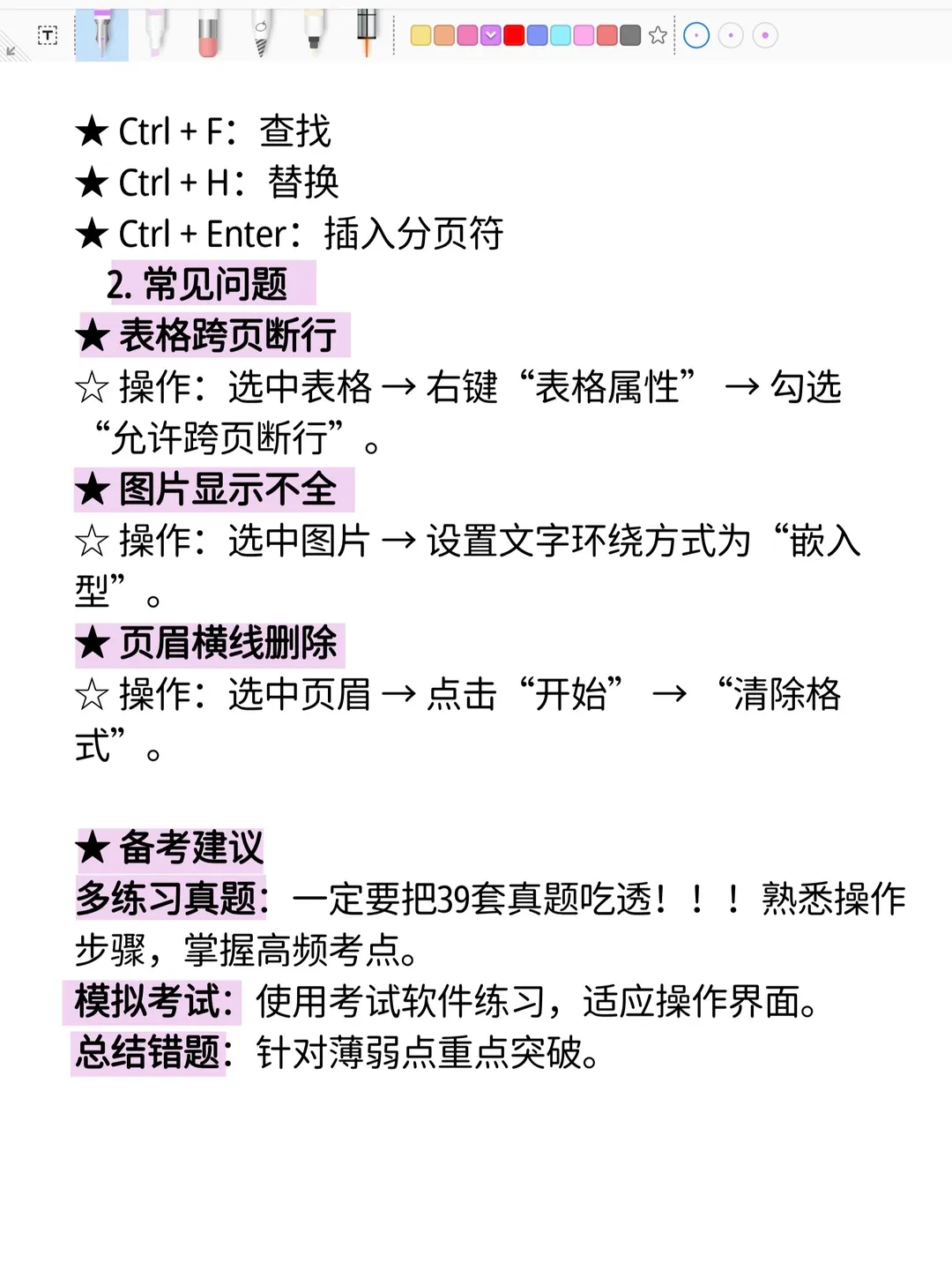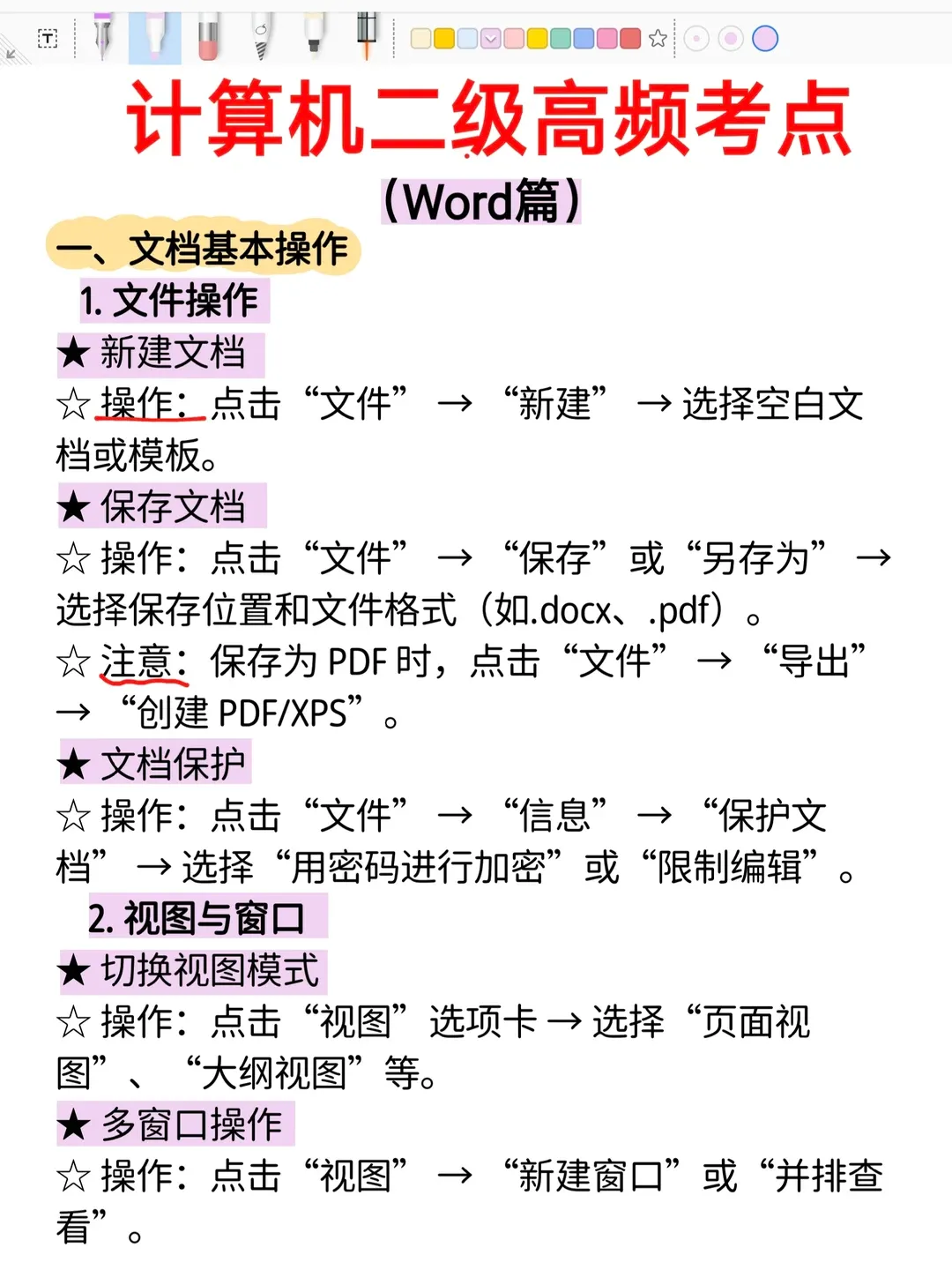 计算机二级高频考点总结—Word篇!赶紧背背 计算机考试高频考点总结—Word篇 一、文档基本操作 1. 文件操作 ✅新建文档 ✅保存文档 ✅文档保护 2. 视图与窗口 ✅切换视图模式 ✅多窗口操作 相对应的视频教程、课件源码、学习笔记,已打包📦好,有需要的关注一下,后台发“111”即🉑拿走!