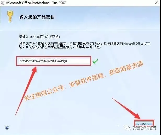 4、在产品秘钥处输入序列号,点击【继续】