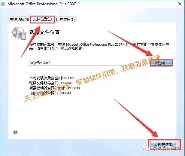 8、点击【文件位置】再点击【浏览】更改到任何盘符,点击【立即安装】