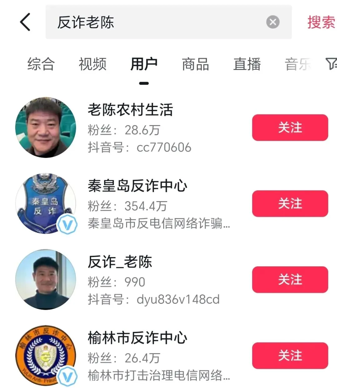 搜索发现,目前“反诈*陈”100余万粉丝主账号,已搜索不到。但是“老陈农村*活”账号,仍显示为正常状态,粉丝为28.5万。
