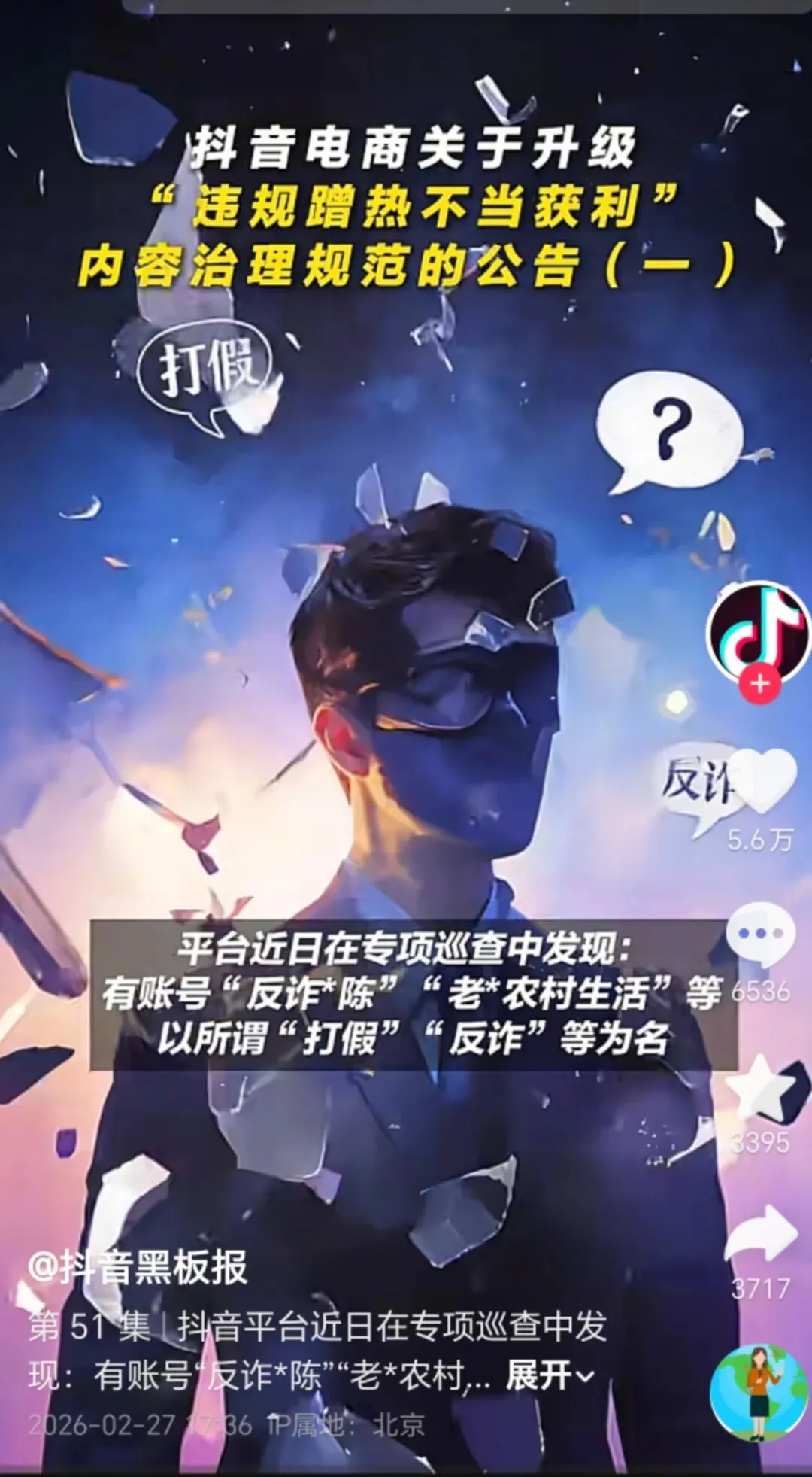 2月27日,抖音黑板报发布内容,对包括“反诈*陈”在内的账号进行通报。通报指出,这些账号以所谓“打假”“反诈”等为名,在缺乏科学分析、缜密研判甚至事实依据的前提下,以“喊话”等形式,反复发布恶意攻击、无端质疑。