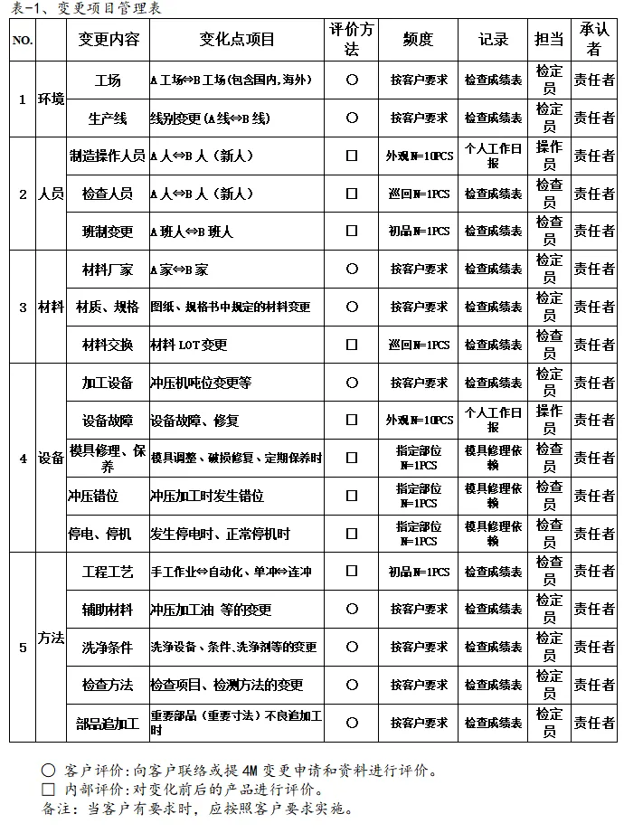适用于对作业人员、机器设备、生产物料、作业方法或工艺流程、制造场所等变更的管理。