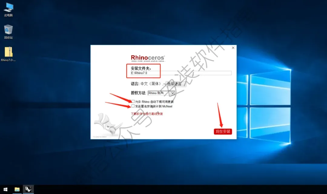 5、输入一开始新建好的Rhino7.0位置,下方两个勾去掉,然后点“现在安装”!