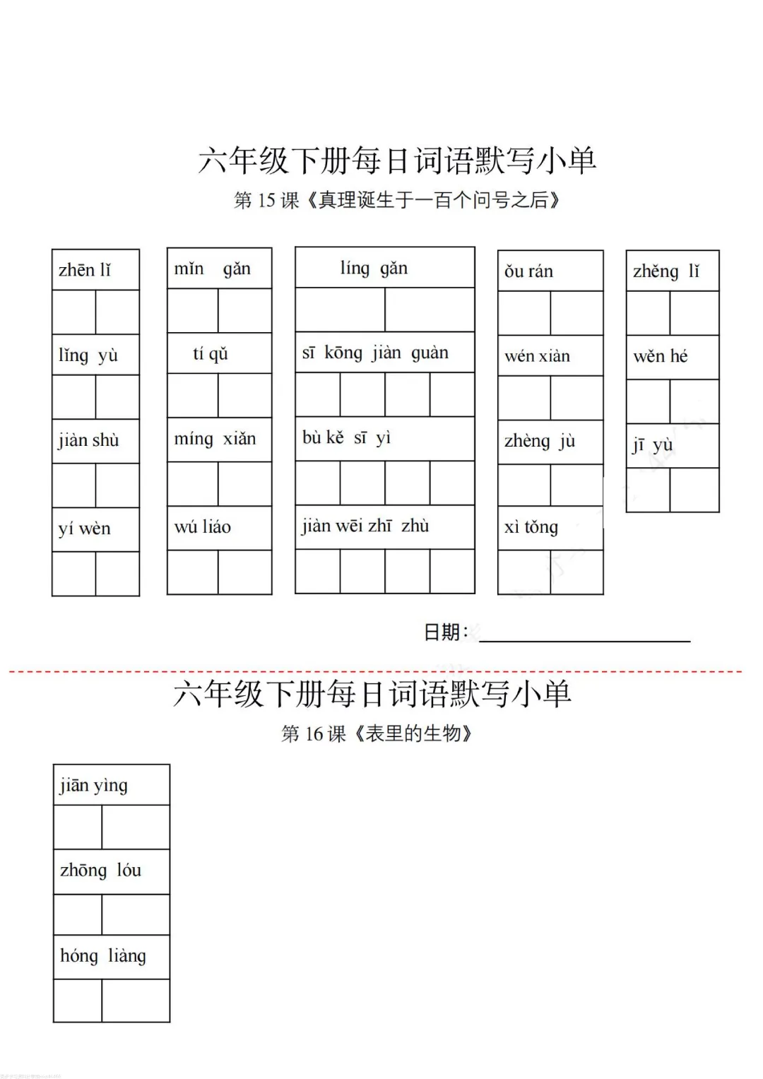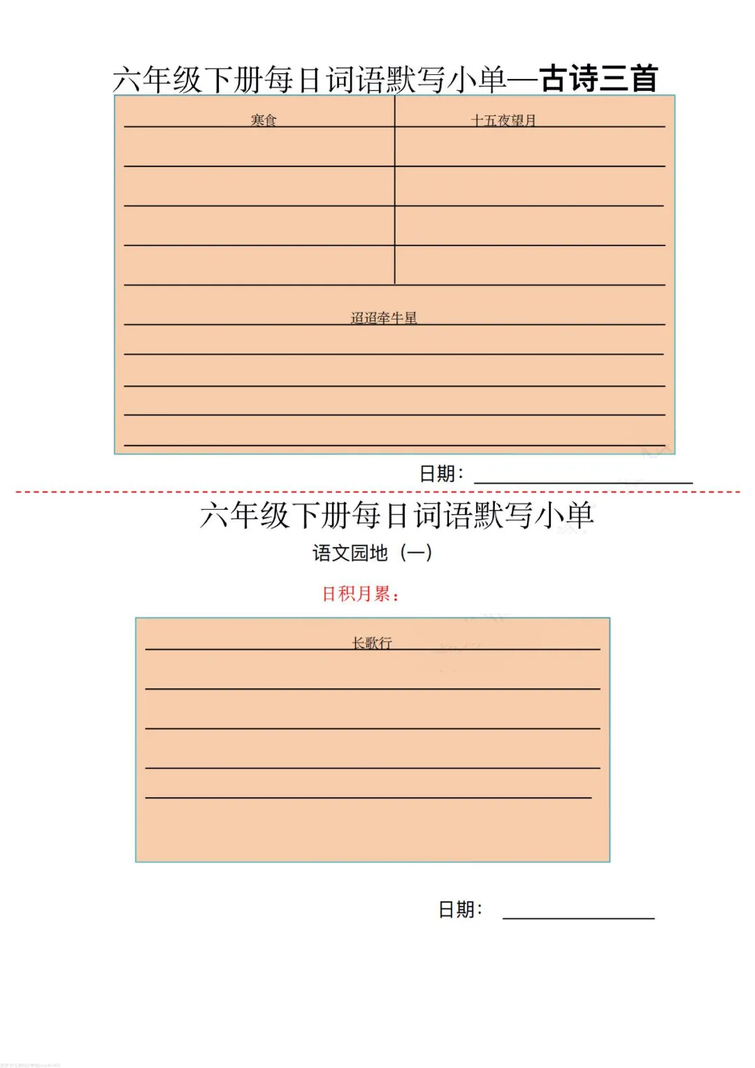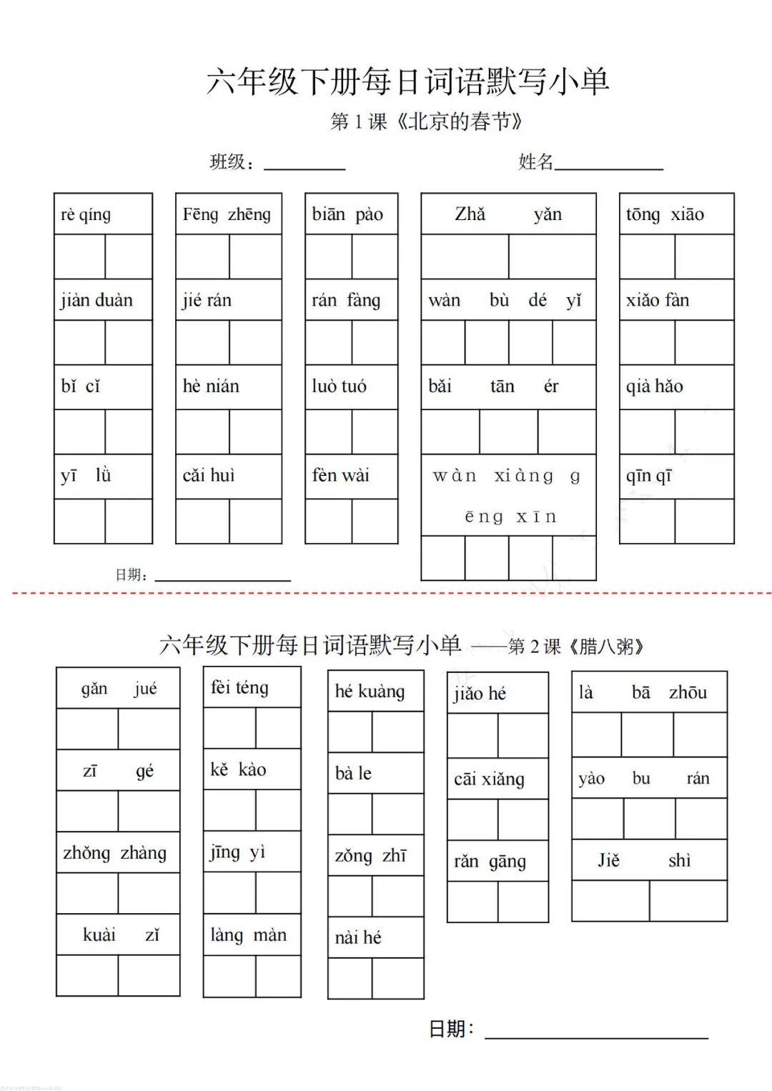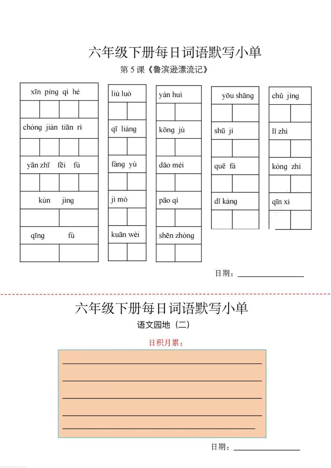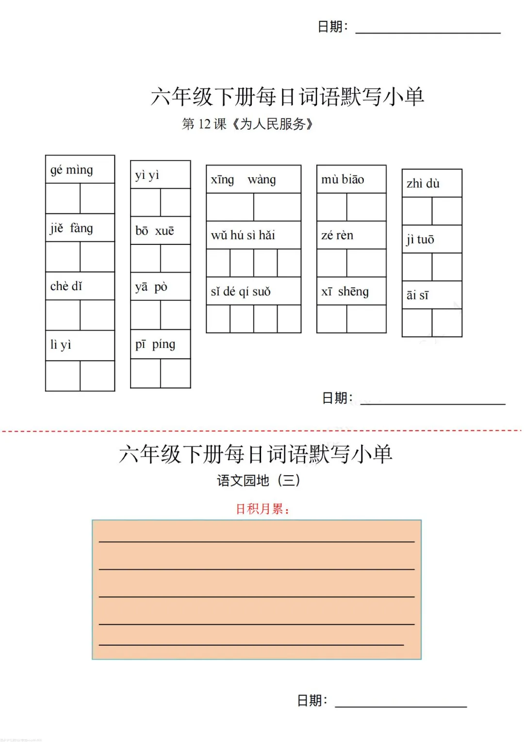 今天给大家分享的是:【六年级下册语文部编版】每日词语默写小纸条丨完整高清电子版可打印