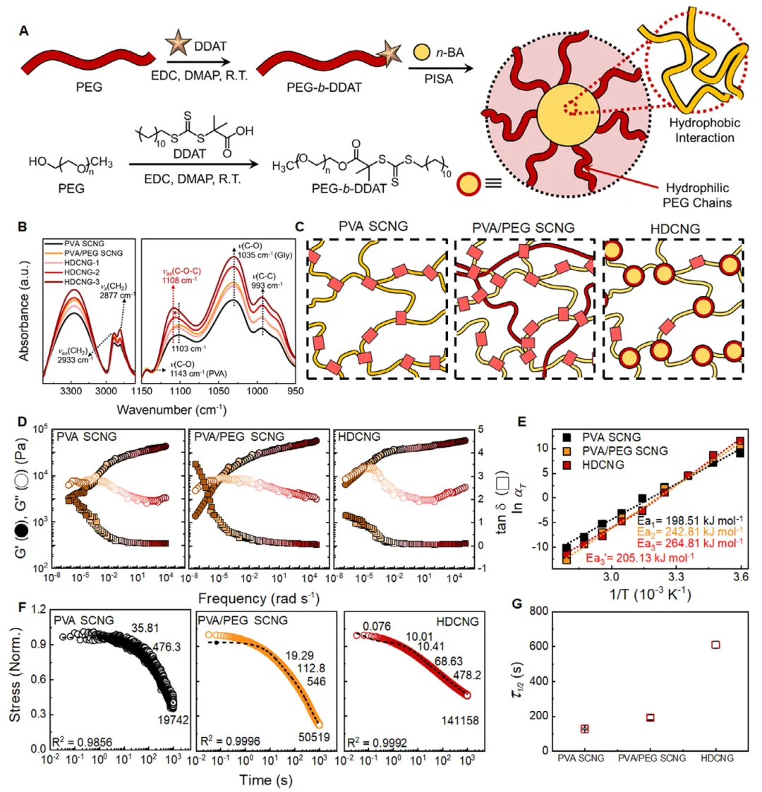 d) 流变测试显示所有样品在25 ℃下G′始终高于G″,表明处于凝胶态。基于时间–温度叠加(TTS)构建主曲线,并通过阿伦尼乌斯分析获得表观活化能。SCNG仅表现出单一弛豫行为,而HDCNG呈现双活化能(264.81 和 205.13 kJ·mol⁻¹),分别对应纳米粒子周围的强氢键交联域和PVA基体中的弱动态氢键,证明形成分级双网络结构。