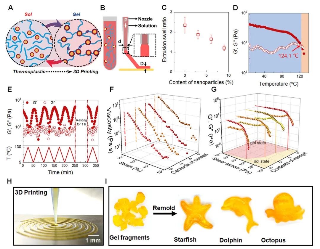 水凝胶在加热至~124°C时发生溶胶-凝胶转变,冷却后可快速重构,支持高精度DIW 3D打印,挤出膨胀比低至1.21,打印结构精细稳定。 -