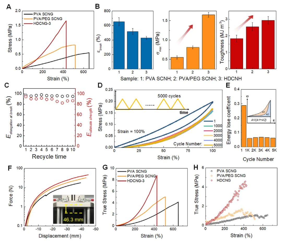 c) 在循环拉伸测试中,HDCNG-3表现出出色的抗疲劳能力。在100%应变下循环5000次后,应力仍保持初始值的83%,能量损失系数仅约0.06,接近先进弹性材料水平。这说明其网络结构能够有效耗散能量,同时避免结构损伤。