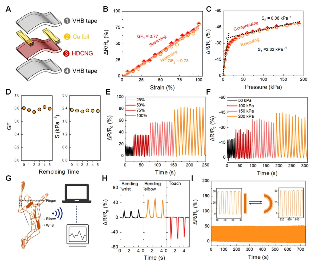b)作为柔性电极,HDCNG可打印成多层结构电子皮肤器件。在拉伸模式下,传感器在0–100%应变范围内呈现良好的线性响应,应变灵敏度GF为0.77,滞后极小,响应/恢复时间分别为 360 ms 和 240 ms。即使在高湿环境(90% RH)下预处理后,性能依然稳定。