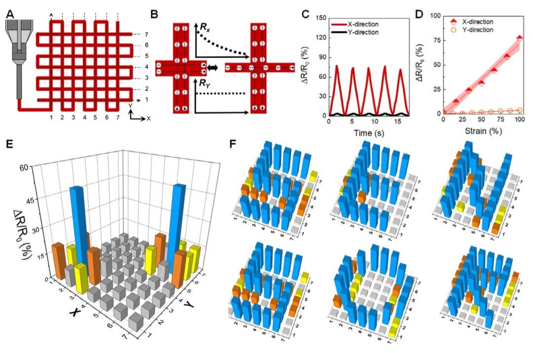 a)基于HDCNG的热塑性与可打印特性,构建了一个像素化传感器阵列。由于打印丝状结构具有取向性,该器件表现出明显的各向异性传感特征:当沿X方向(平行打印方向)拉伸时,导电通路发生显著形变,电阻变化明显,灵敏度 GFₓ = 0.77;而沿Y方向仅产生微小形变,灵敏度低至 GFᵧ = 0.04。这种差异使器件能够精准区分力的方向。