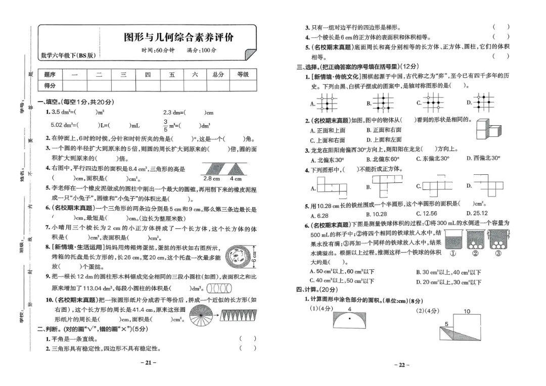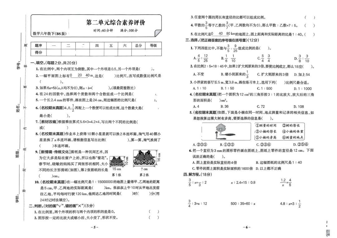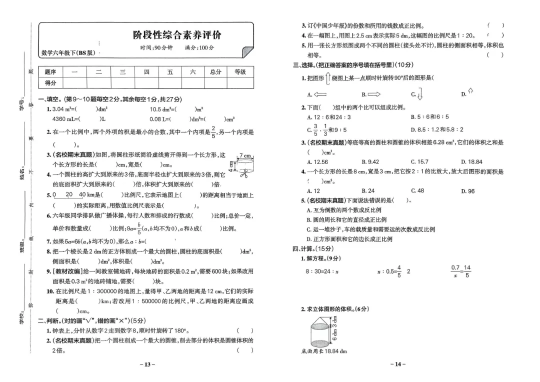 今天给家长们分享的是:【北师大版】2026年春新版六年级下册数学《1-7单元素养卷+期中期末测试卷》(共8套附答案)‖高清电子版可打印