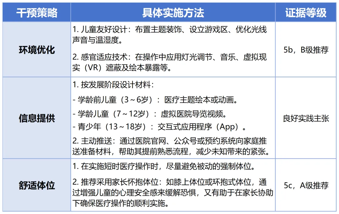 适用于所有为儿童提供医疗保健服务的各级医疗保健机构,其推荐实践适用于( 但不限于) 门诊及急诊区域、住院及手术区域( 如普通住院病房、日间手术中心、手术室、麻醉诱导室和重症监护室等) 、诊断与治疗区域( 如影像科、内镜中心、血液透析室和口腔科等) 。