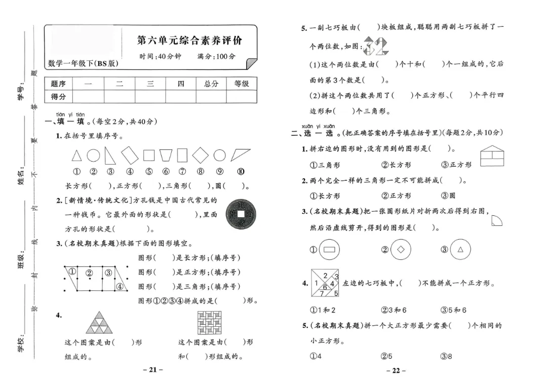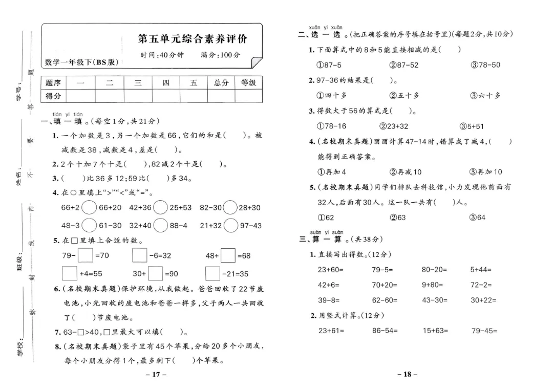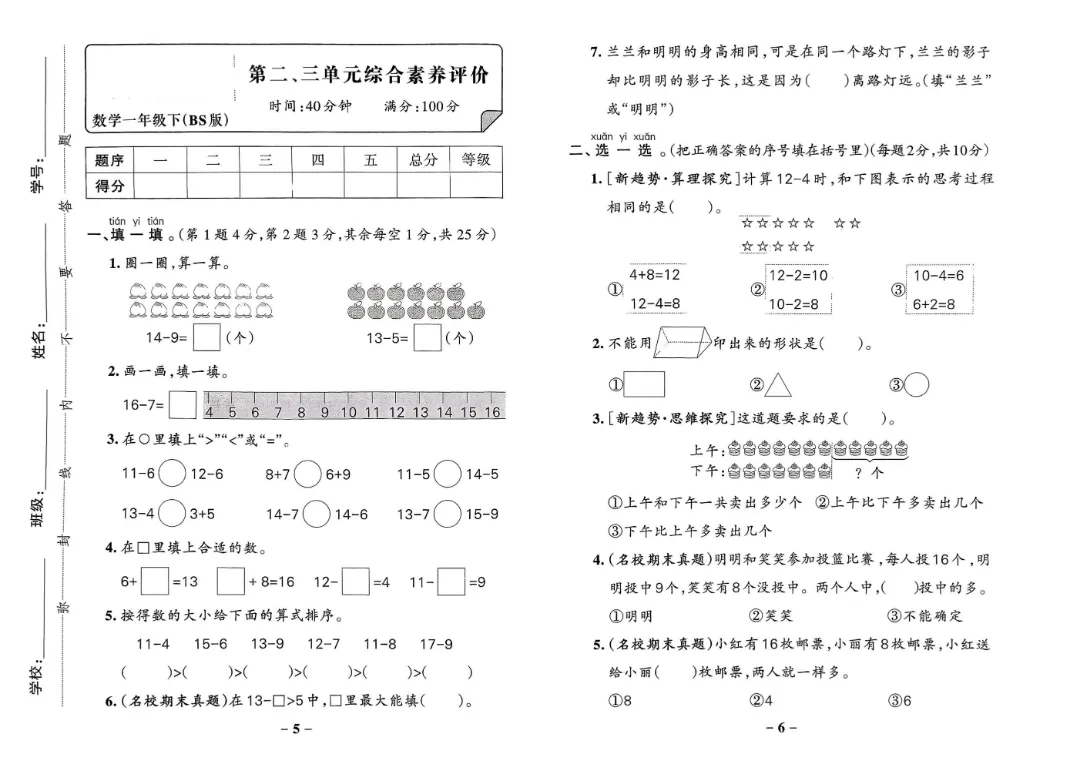 今天给家长们分享的是:【北师大版】2026年春新版一年级下册数学《1-6单元素养卷+期中期末测试卷》(共8套附答案)‖高清电子版可打印