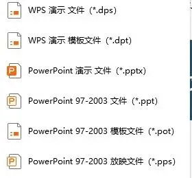 文件常见后缀名“.ppt”、“.pptx”(pptx是高版本,如果电脑上装载的office软件版本低则有可能无法打开),dps是WPS专用文件格式。