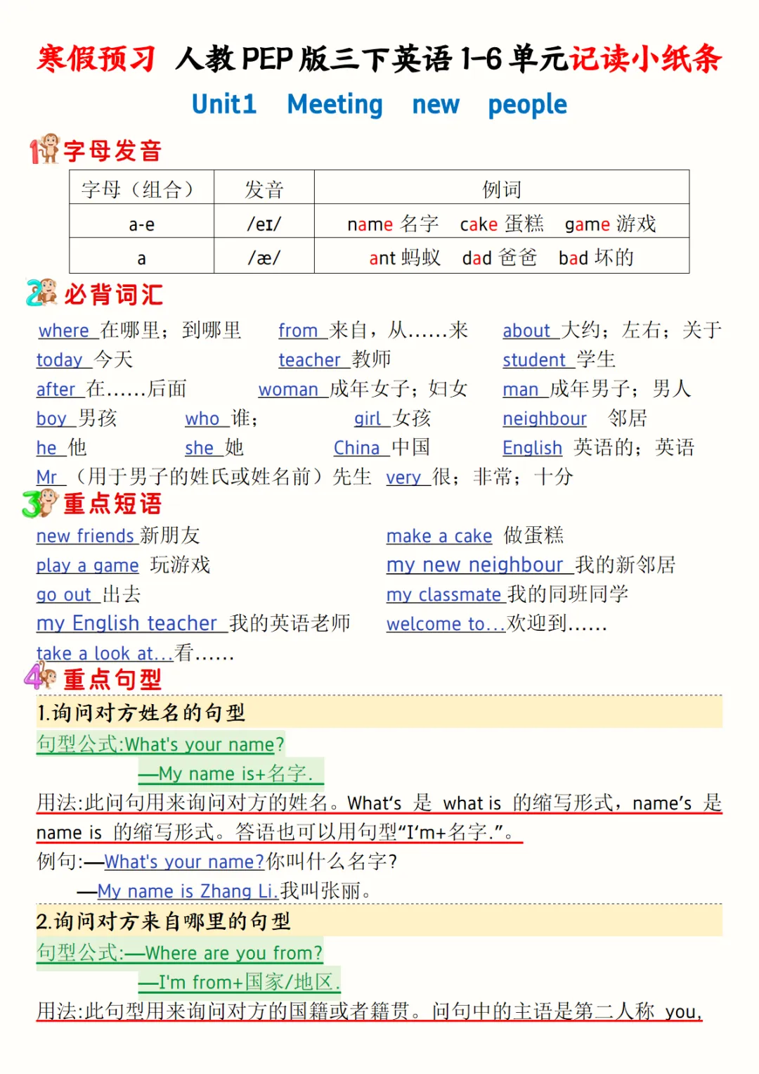 三年级(下)英语 寒假预习1-6单元记读小纸条《人教版PEP》
