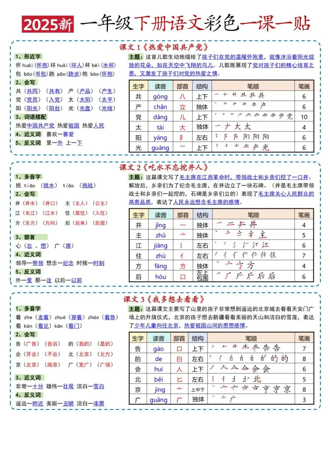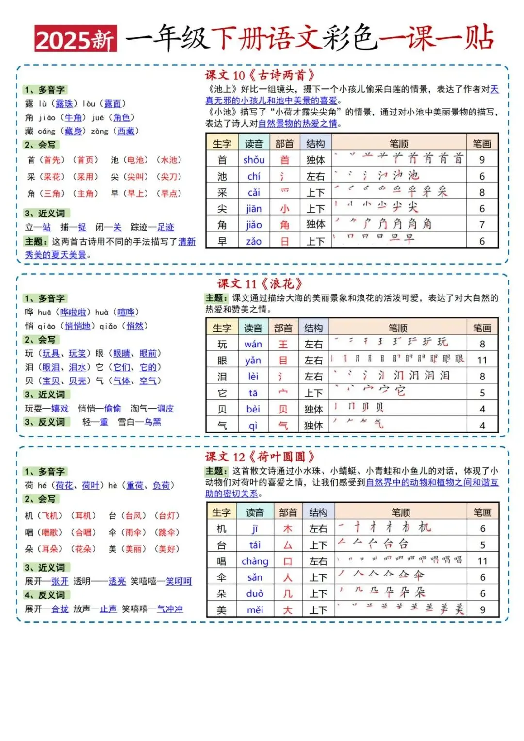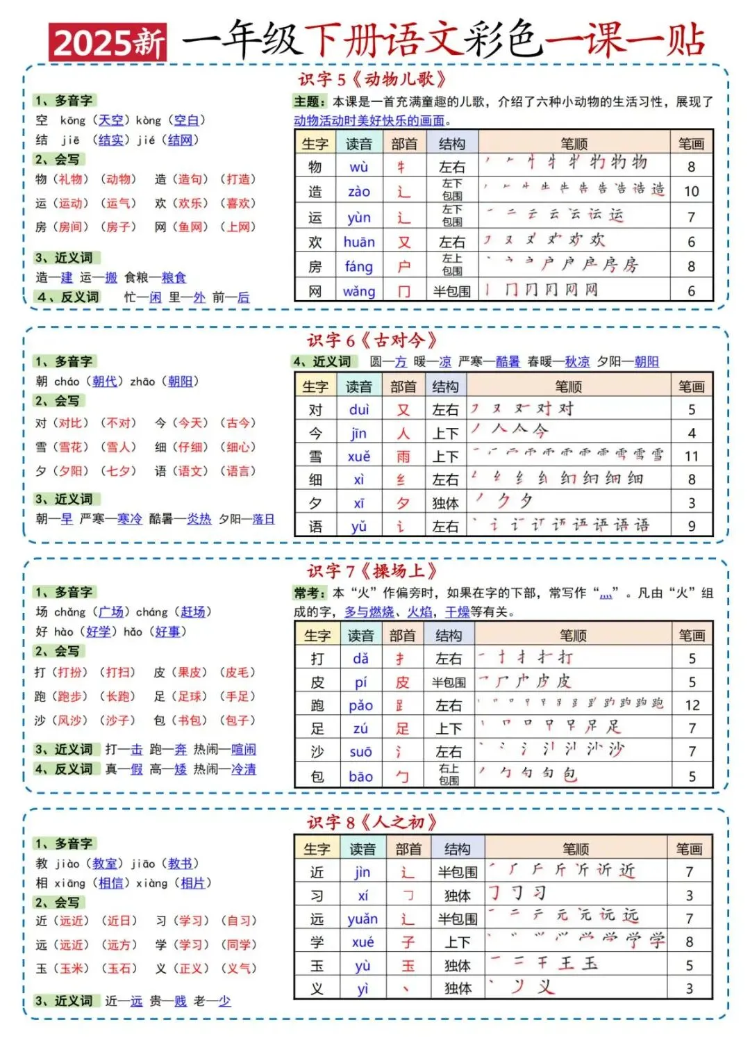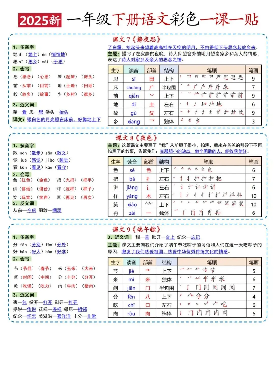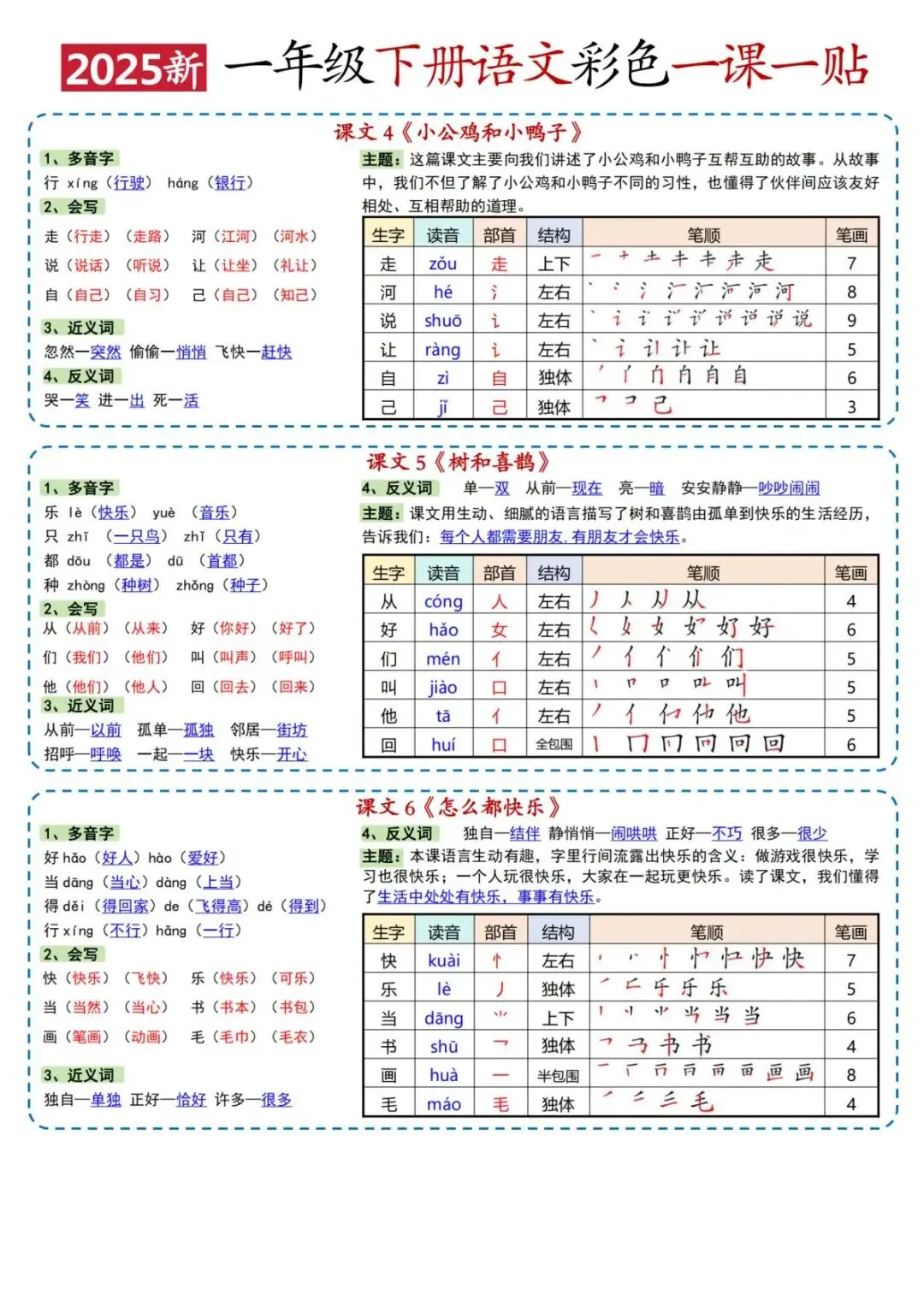 今日给大家分享的是:2026年春一年级下册语文彩色一课一贴,可电子版下载打印。