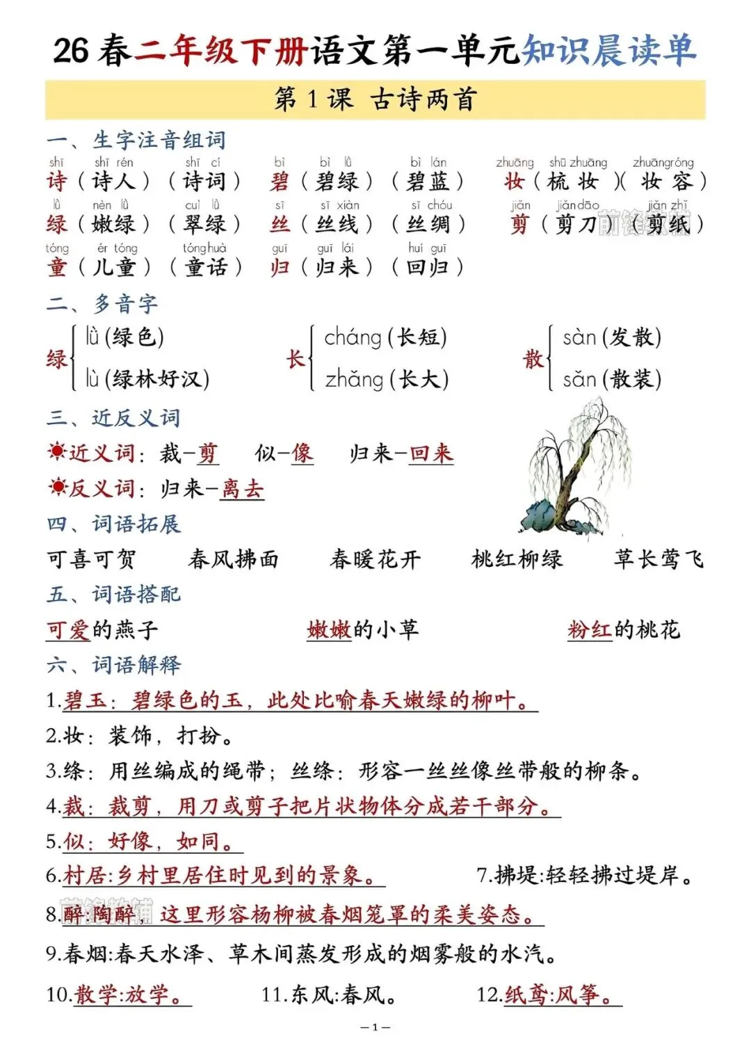 2026春二年级下册语文知识晨读单(电子版可打印) 26年春人教版《二年级下册语文知识晨读单》完整电子版可下载打印.这份晨读单把每课的生字组词注音、多音字、近反义词、词语拓展、词语解释、中心思想、全部归纳总结.帮助孩子提高晨读效率!需要的家长领回去给孩子练一练吧!看文末的领取方式前来拿👏👏 ⚠️温馨提示:文末有完整电子版领取方式 领取电子版如下: ① 点一点右下角的“赞”和“在看” 感谢!爱你呦🌹 ②关注公众号在 对话窗口回复关键词:0 0 2即可领取!!(⚠️是在对话窗口回复呦)