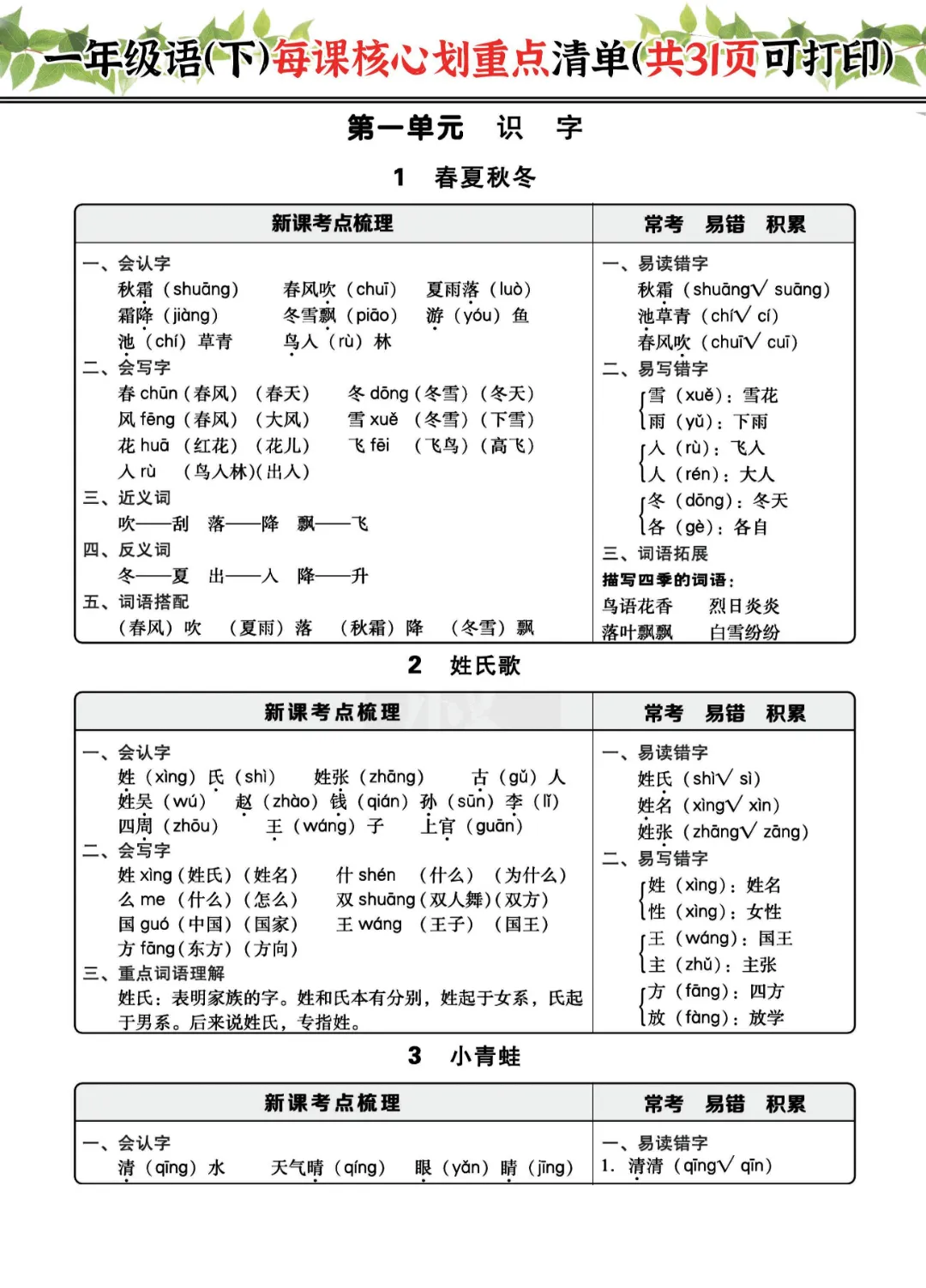 2026年一年级下册语文每课核心划重点(电子版可打印)