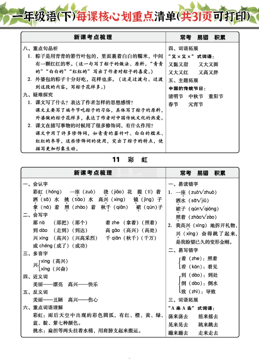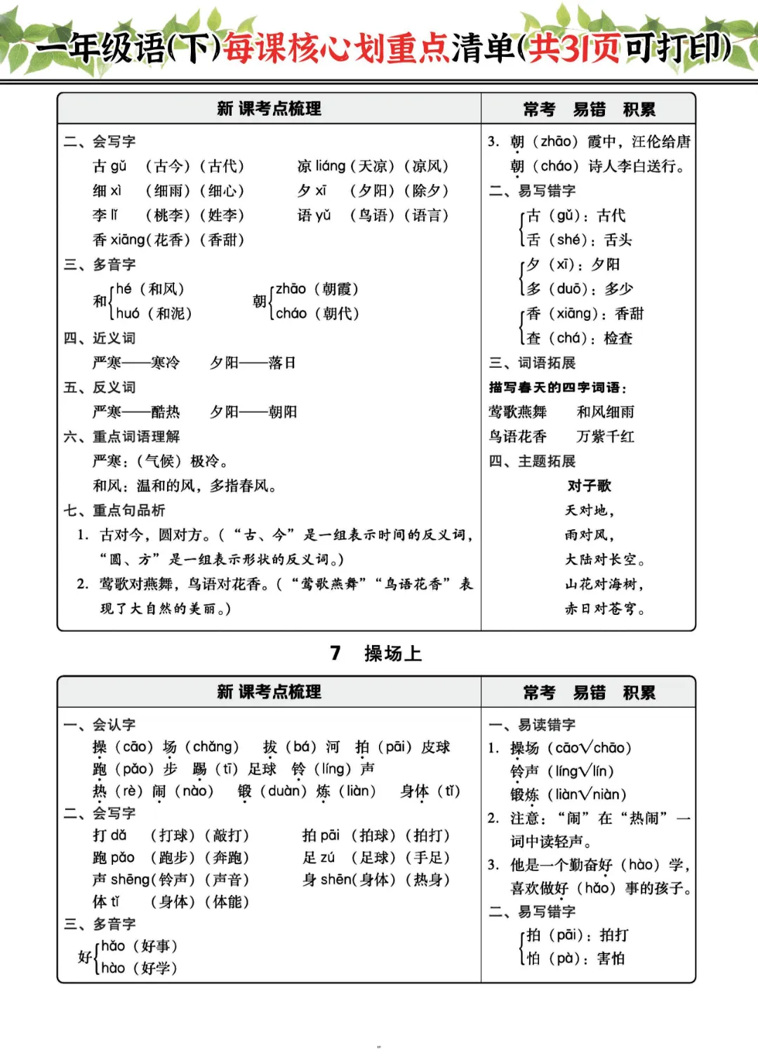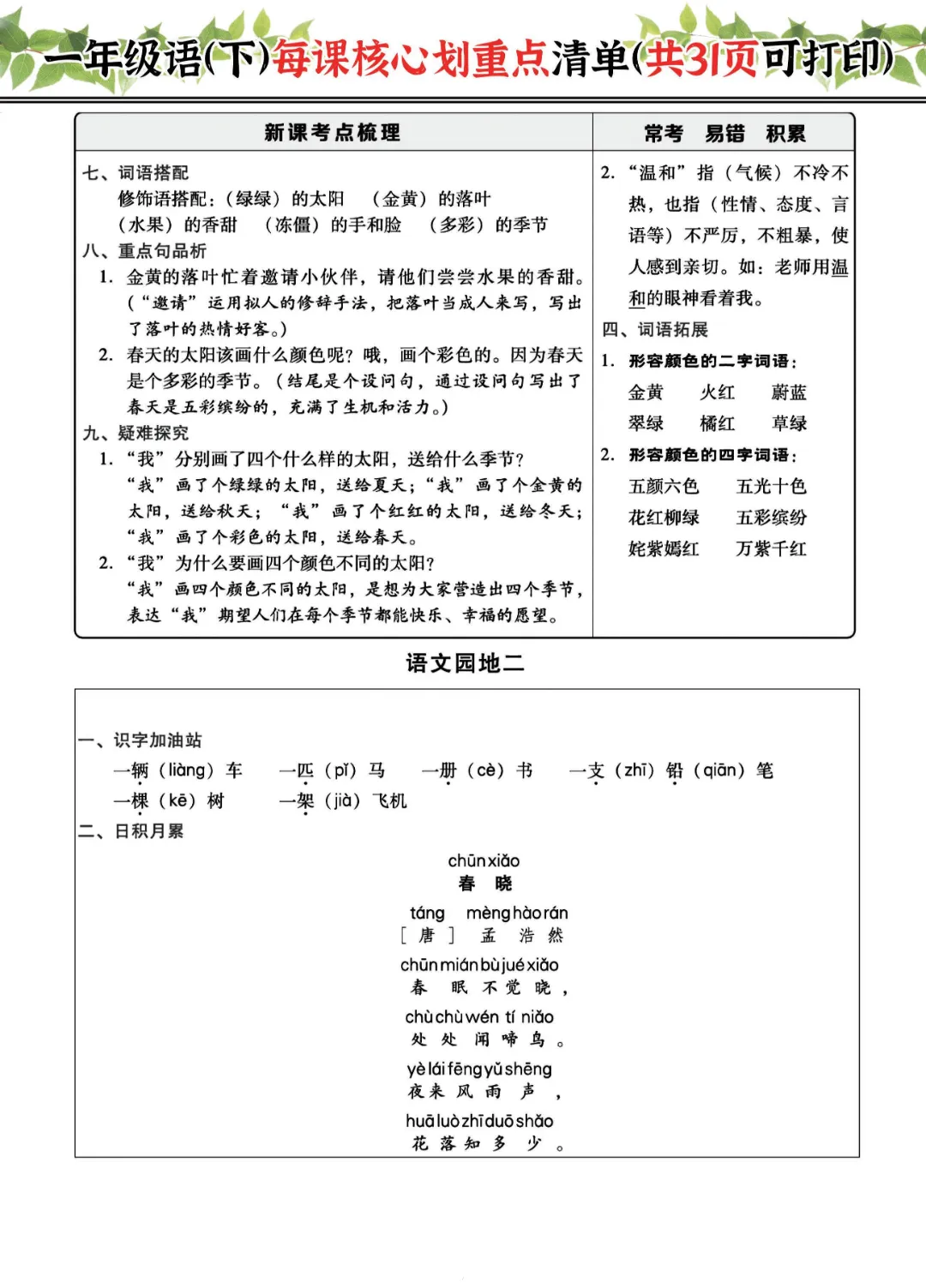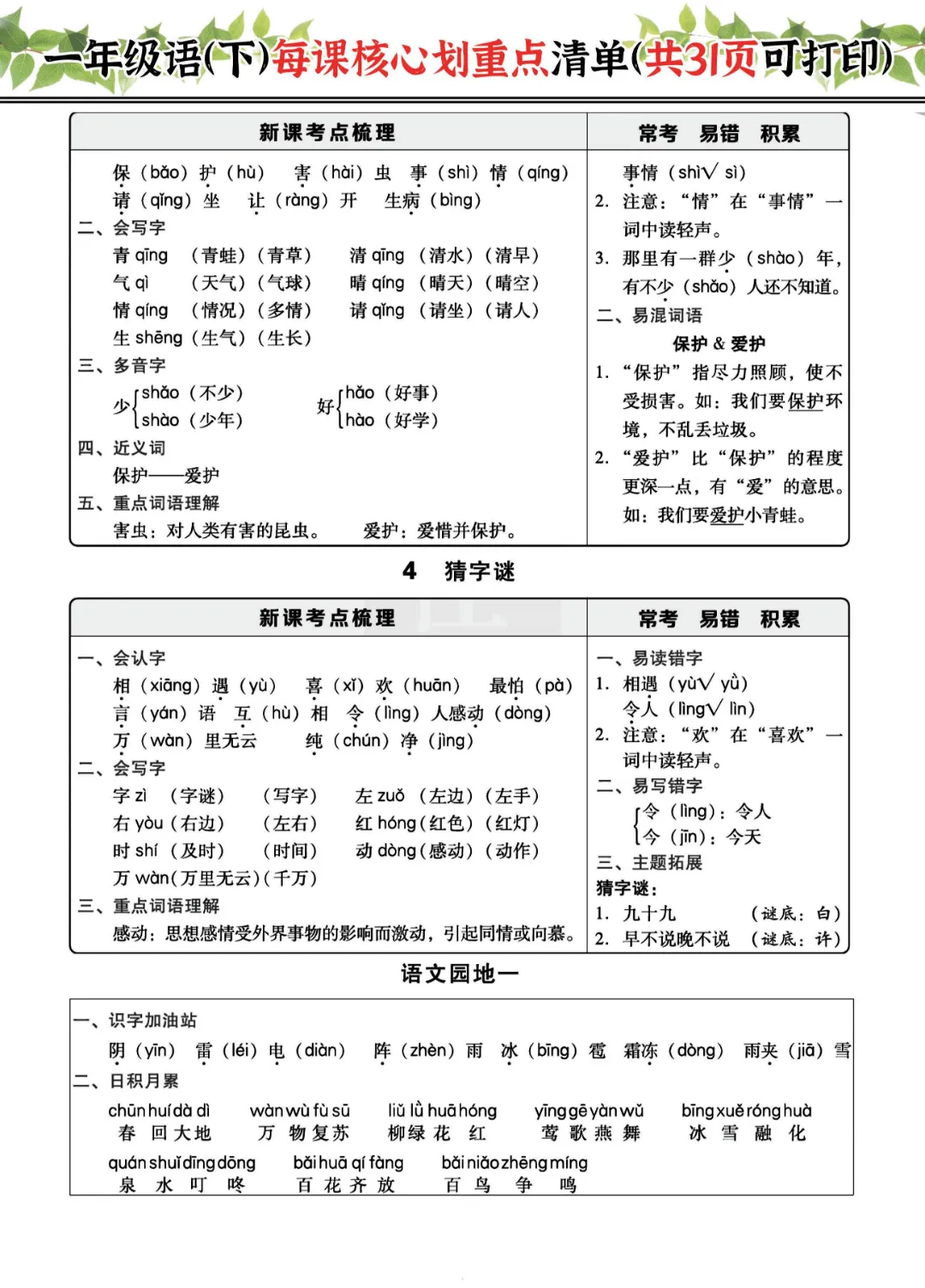 2026年一年级下册语文每课核心划重点|电子版可打印