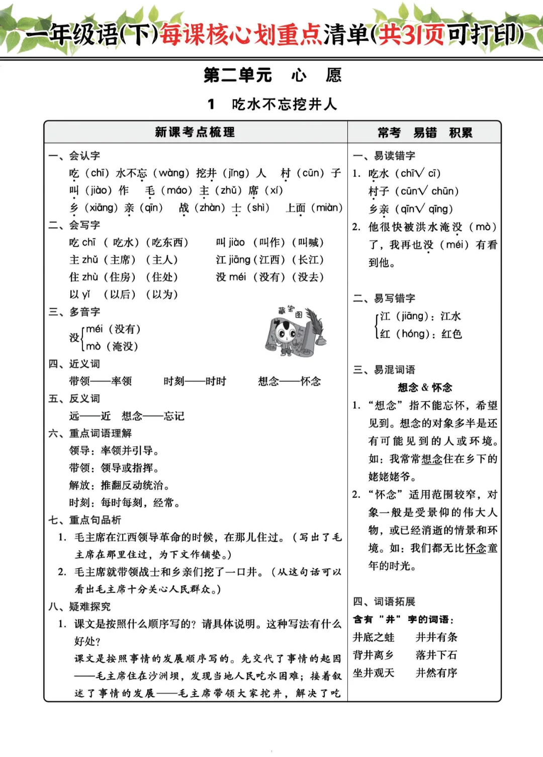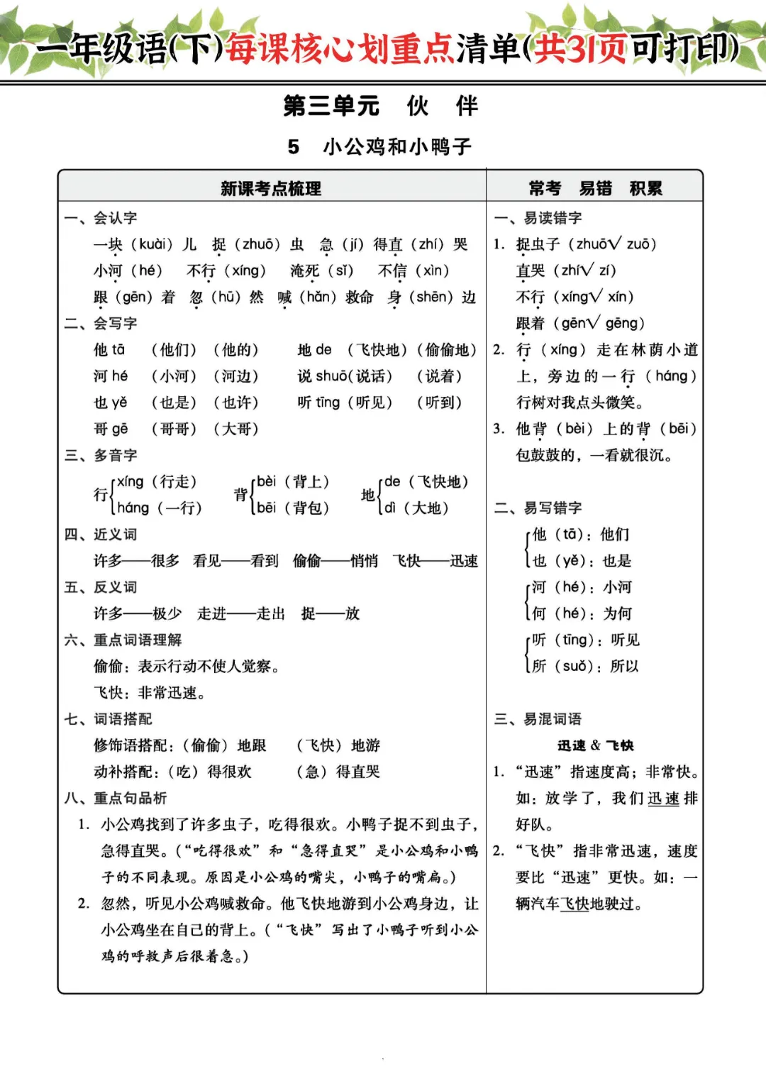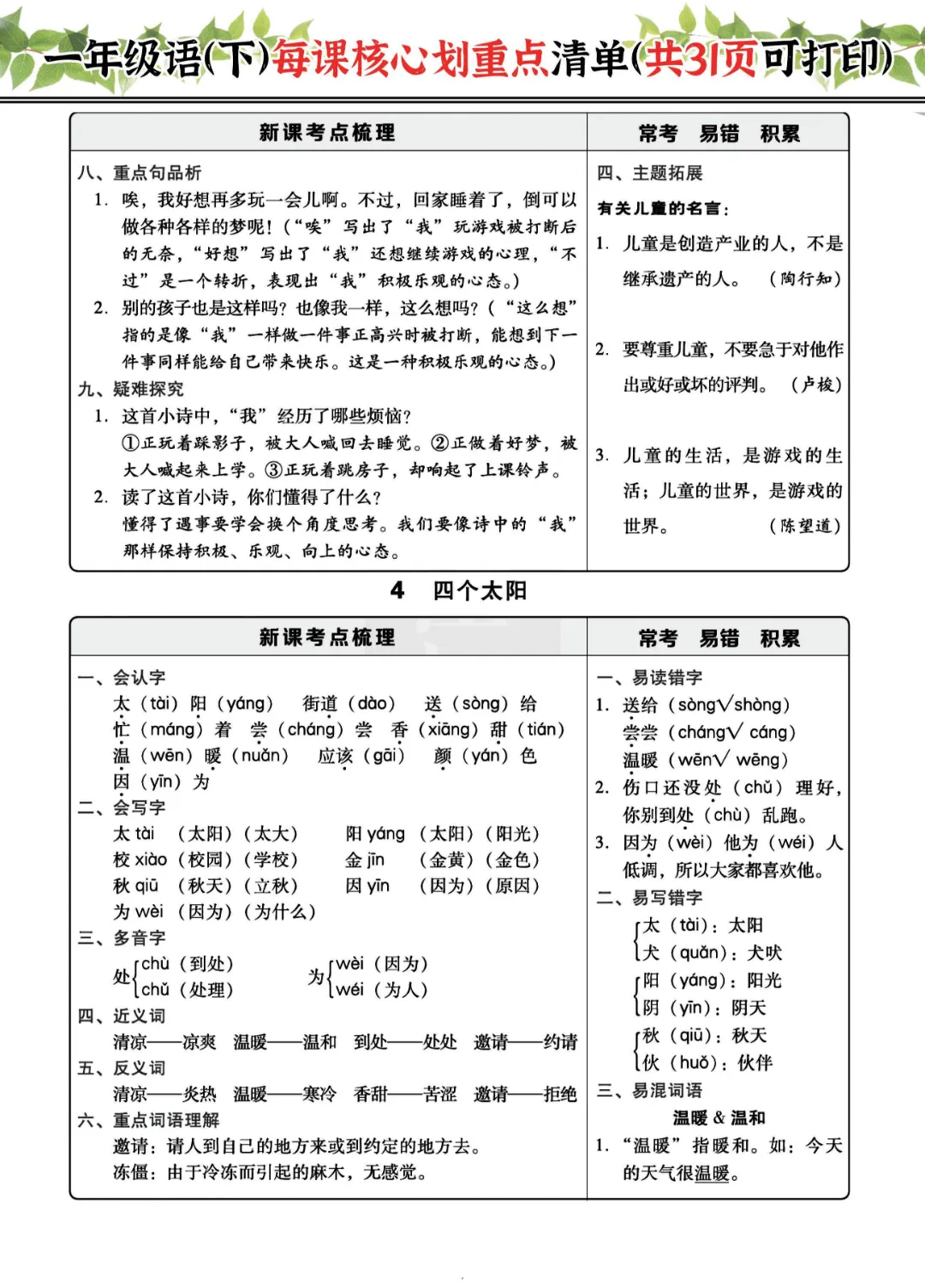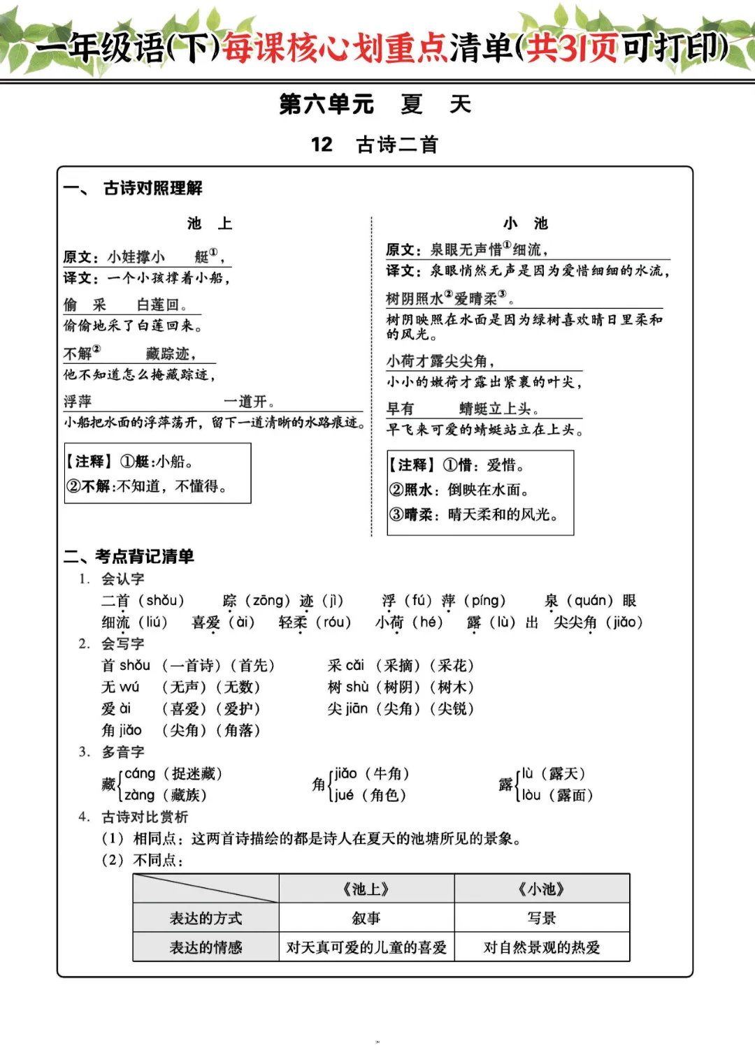 2026年一年级下册语文每课核心划重点|电子版可打印