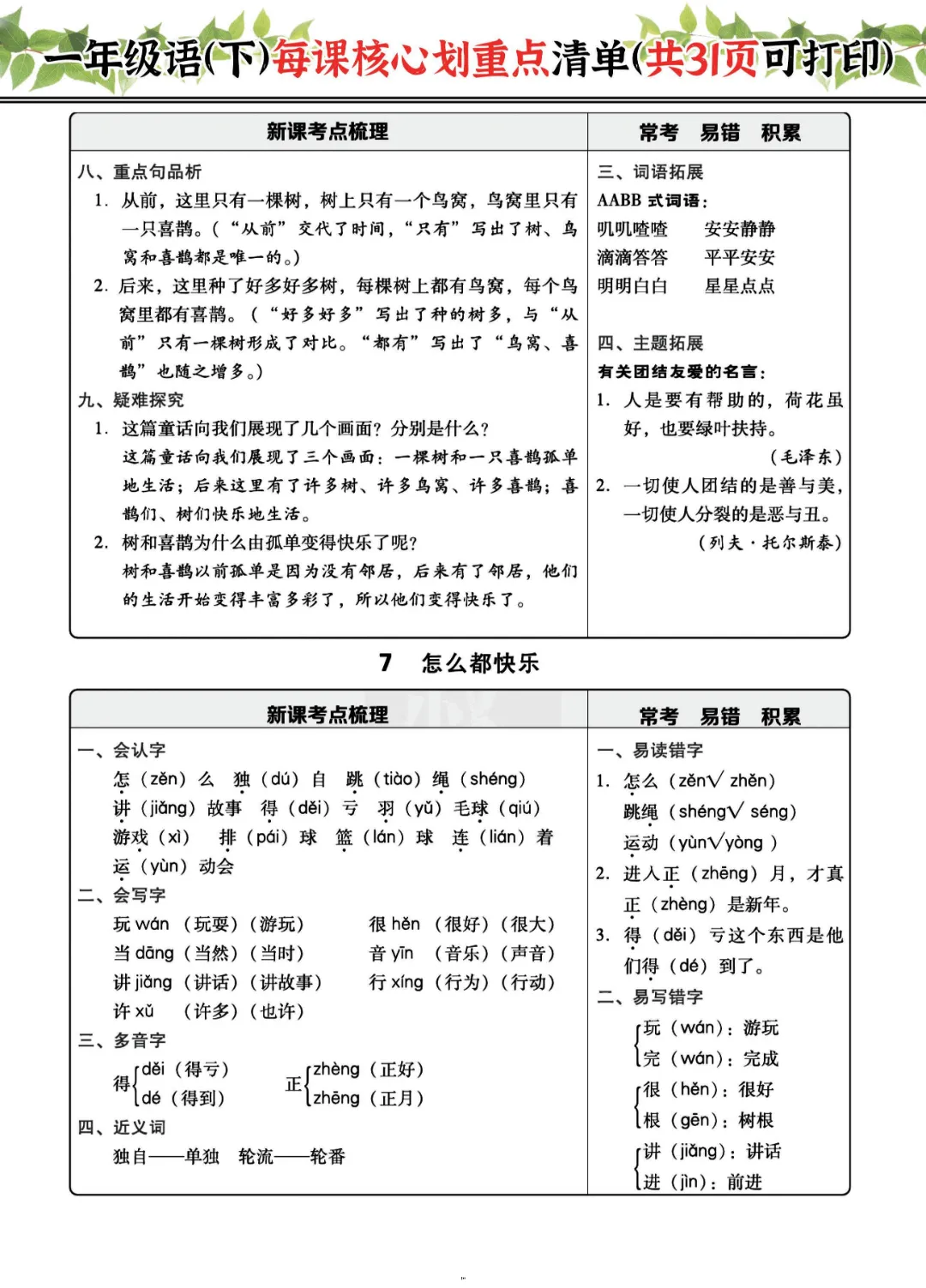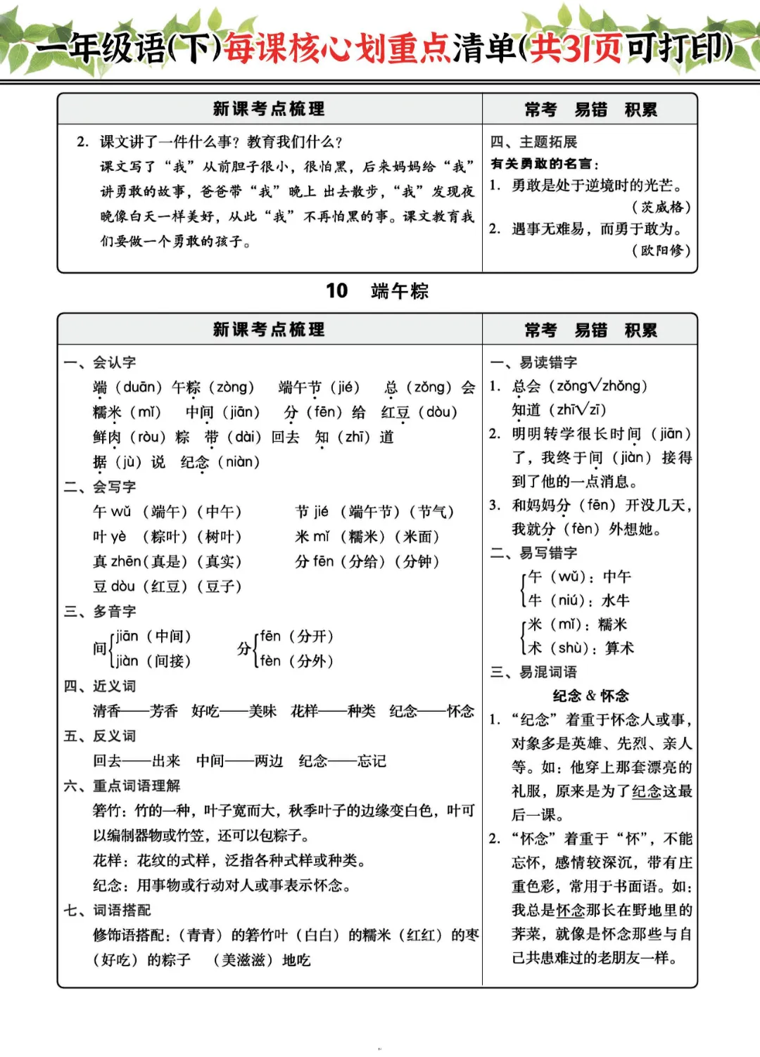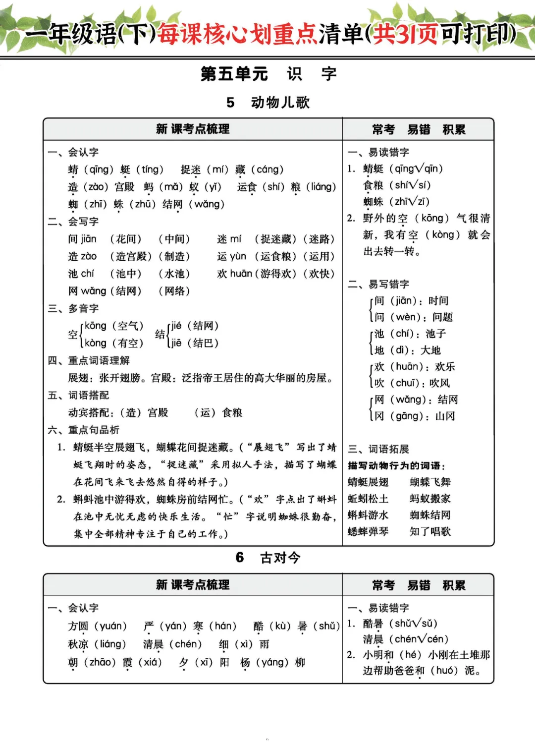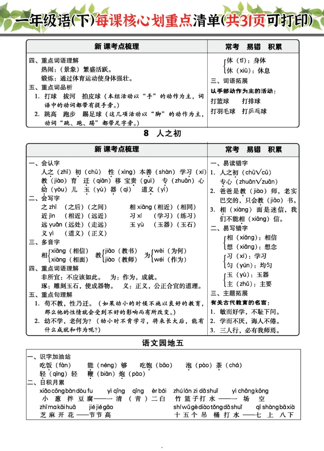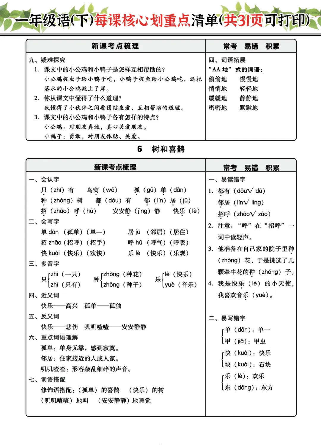 2026年一年级下册语文每课核心划重点|电子版可打印