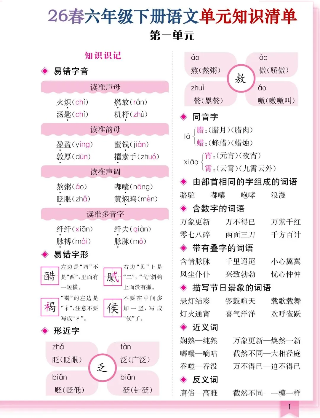 26春六年级下册语文单元知识清单 《部编版》|高清电子版可打印