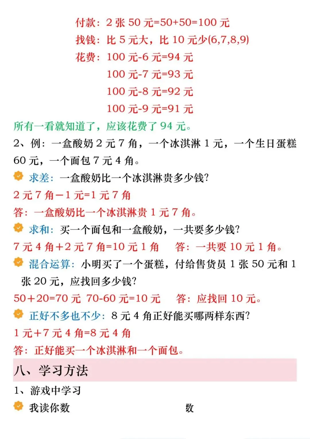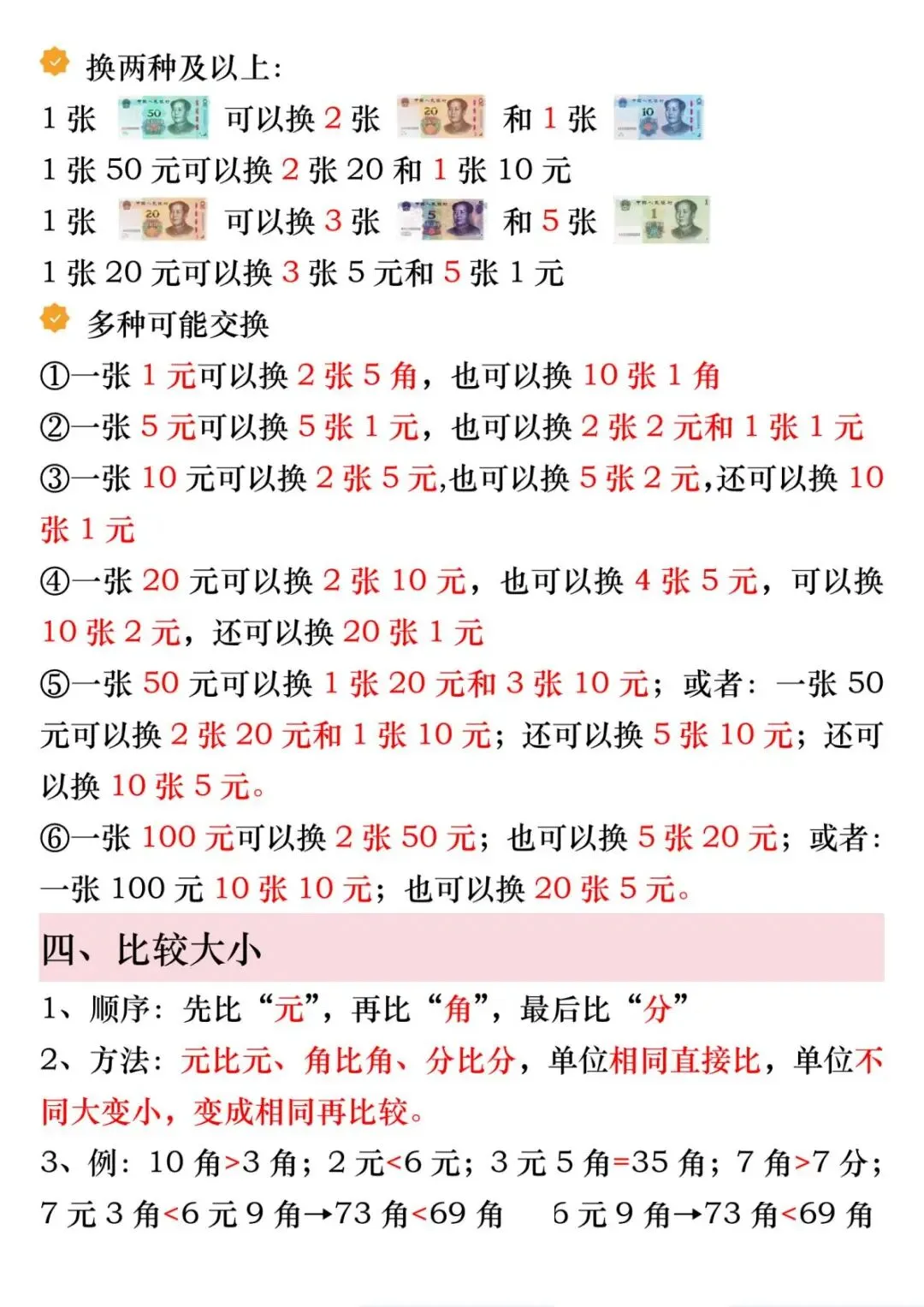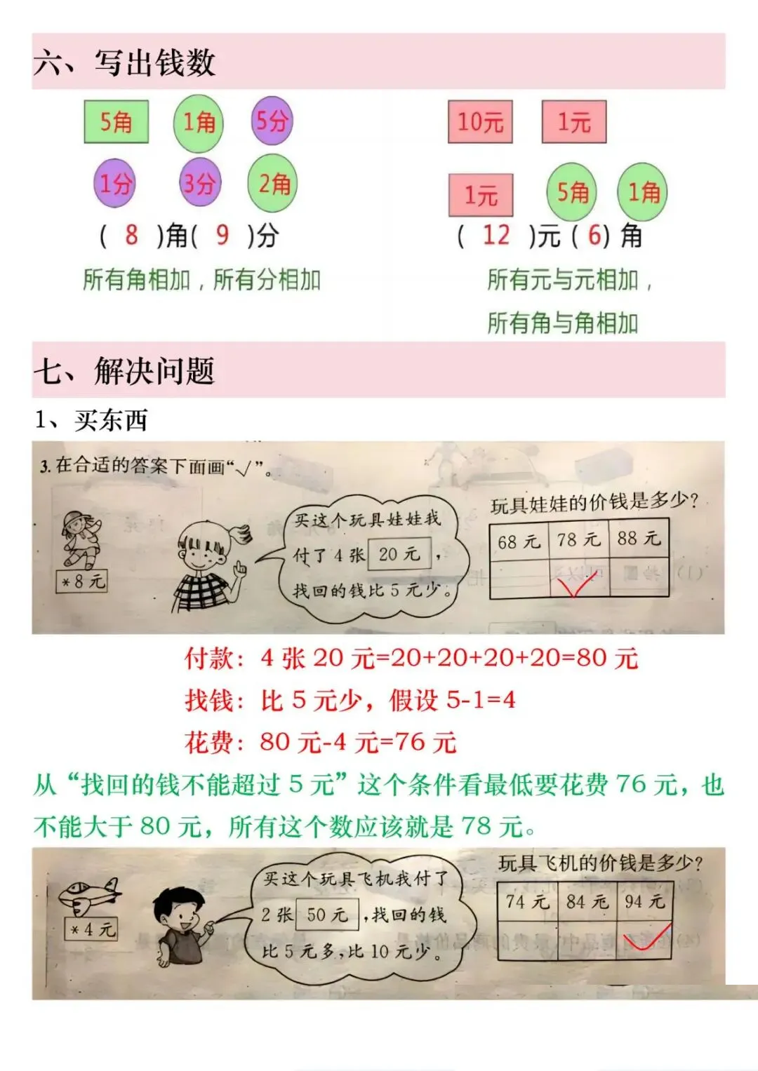 1份电子版汇总!一年级下册数学人民币6大必考知识点,精讲+练习全包含