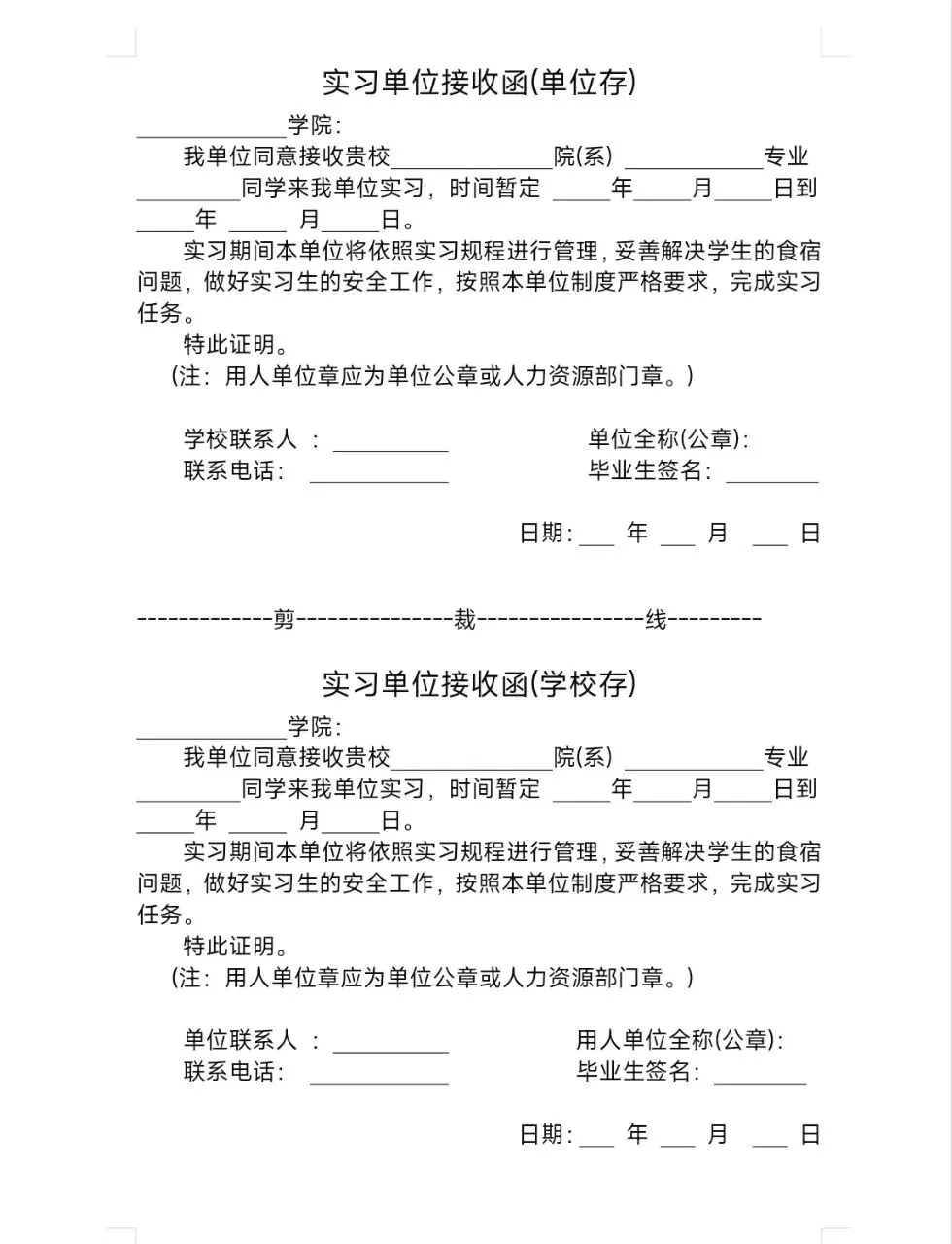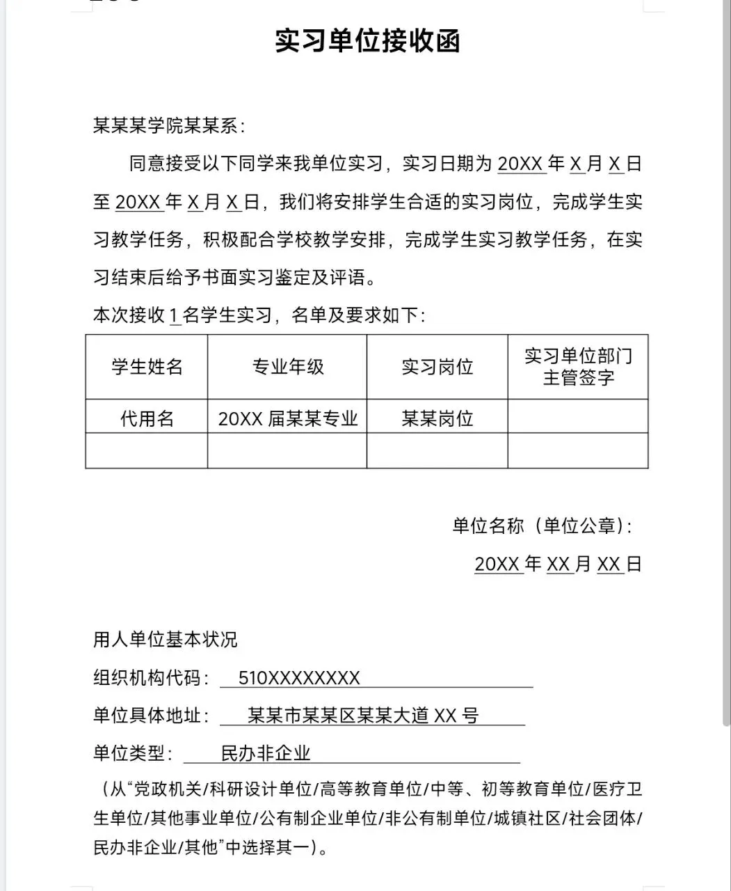 实习单位接收模板电子版分享(可打印下载)