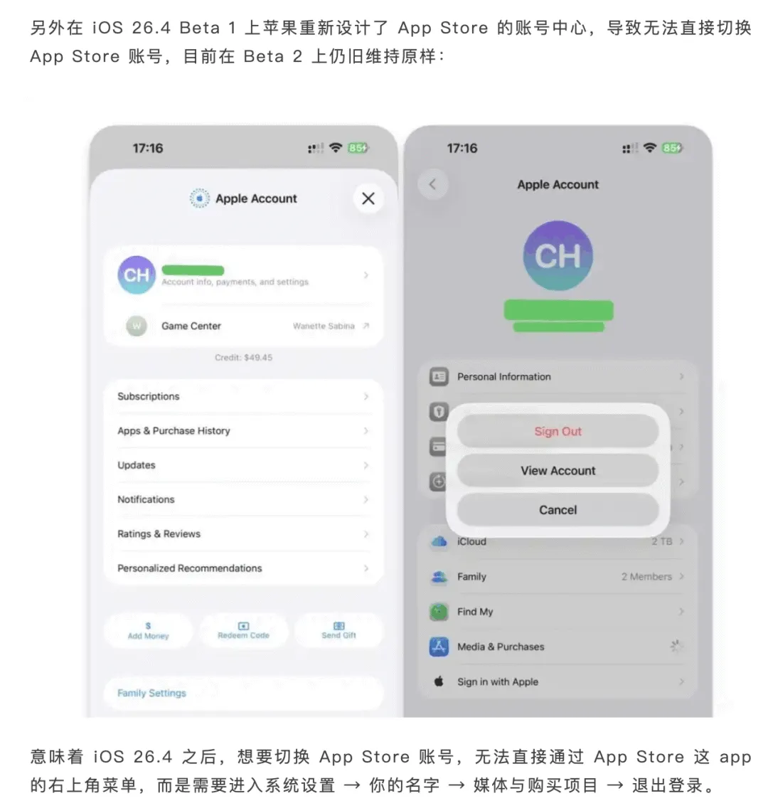 苹果在 iOS 26.4 (目前是测试版)之后取消了在 App Store 直接切换 Apple ID 账号的入口。对于早已习惯的人来说有点不适应,甚至略麻烦。