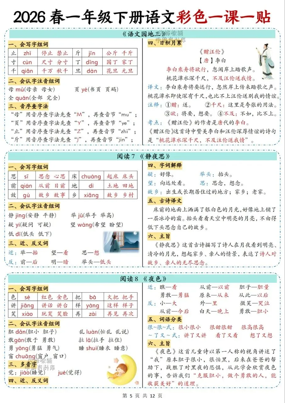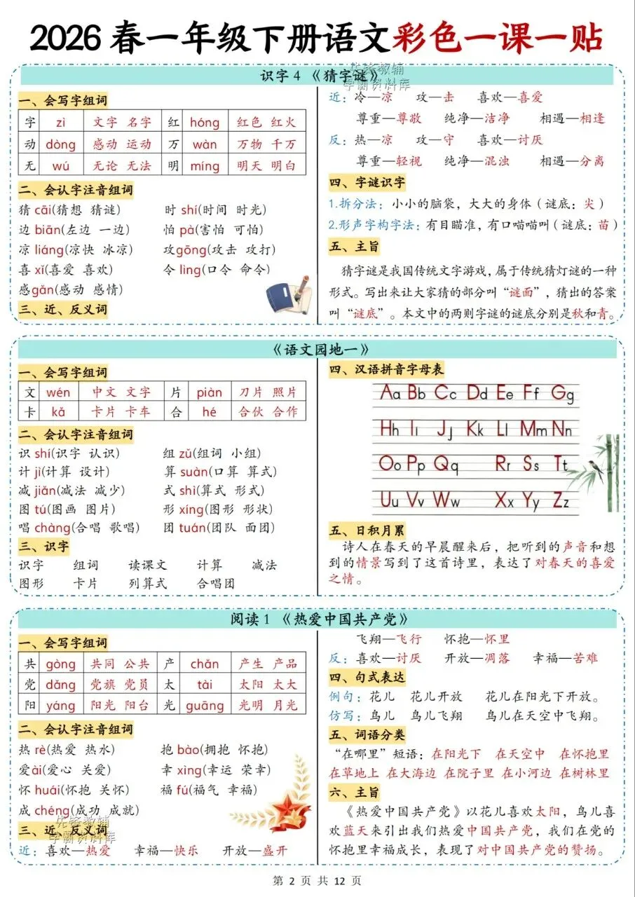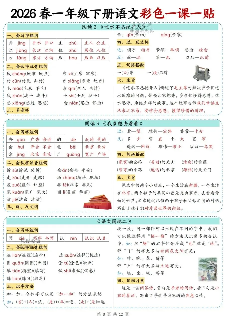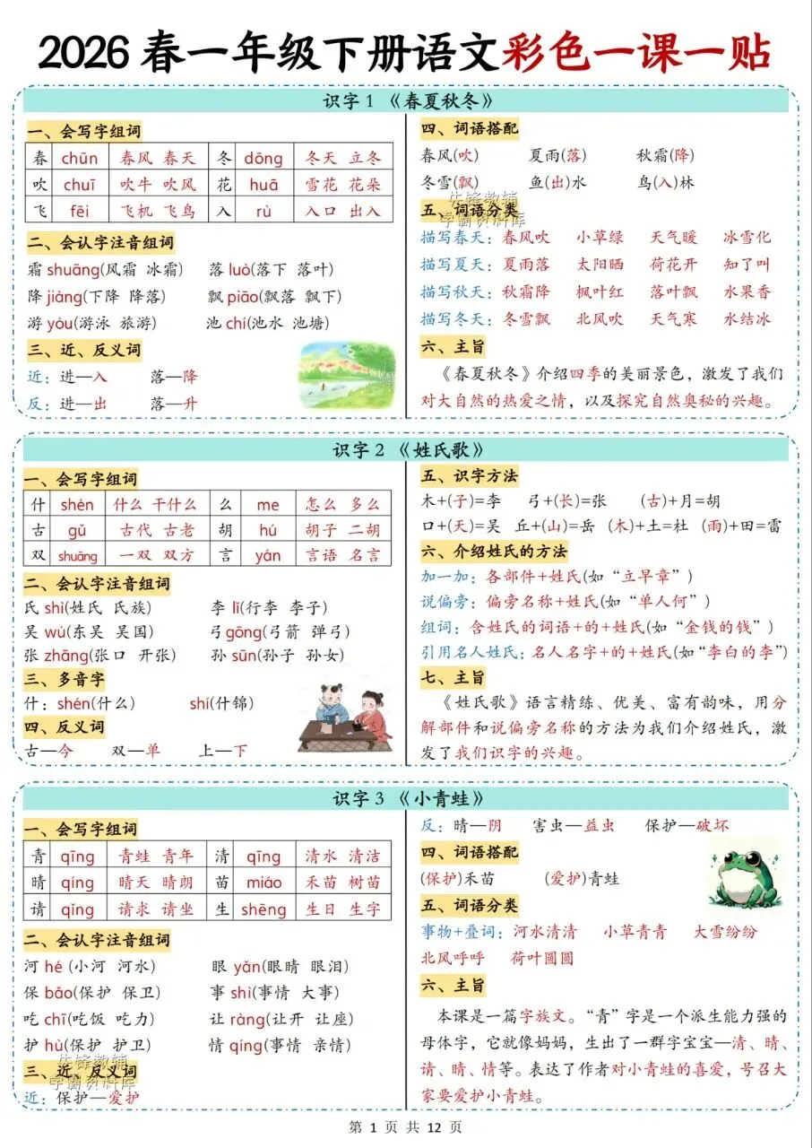 今日分享~2026春一年级语文下册《一课一贴》覆盖识字、阅读、语文园地全板块核心内容。按篇目梳理会写字/认字的注音组词,搭配近反义词、多音字、词语搭配与分类,还附识字方法、句式仿写、音序查字法等实用知识点;每篇均解读主旨,语文园地收录日积月累、古诗译文及考点,贴合低年级语文学习与复习需求。