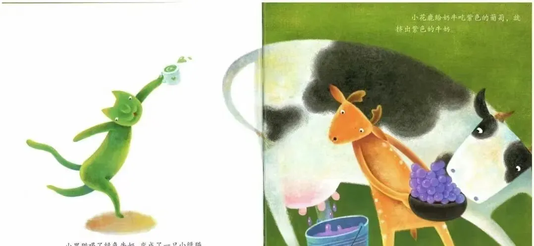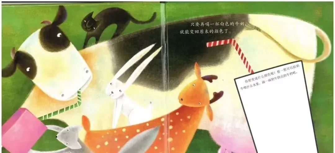 《彩色牛奶》是一篇奇妙的、充满想象力的童话故事。牛大叔带来的奶牛很神奇,喂它吃什么颜色的蔬菜,就会挤出什么颜色的牛奶,小动物们喝了,还纷纷变了样。小白兔变成了小黄兔,小黑猫变成了小绿猫。故事中富有想象力的情节带领幼儿走进奇妙的童趣世界,接下来会发生什么有趣的事情呢?
