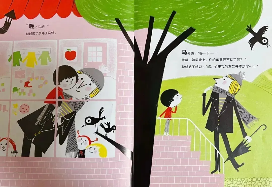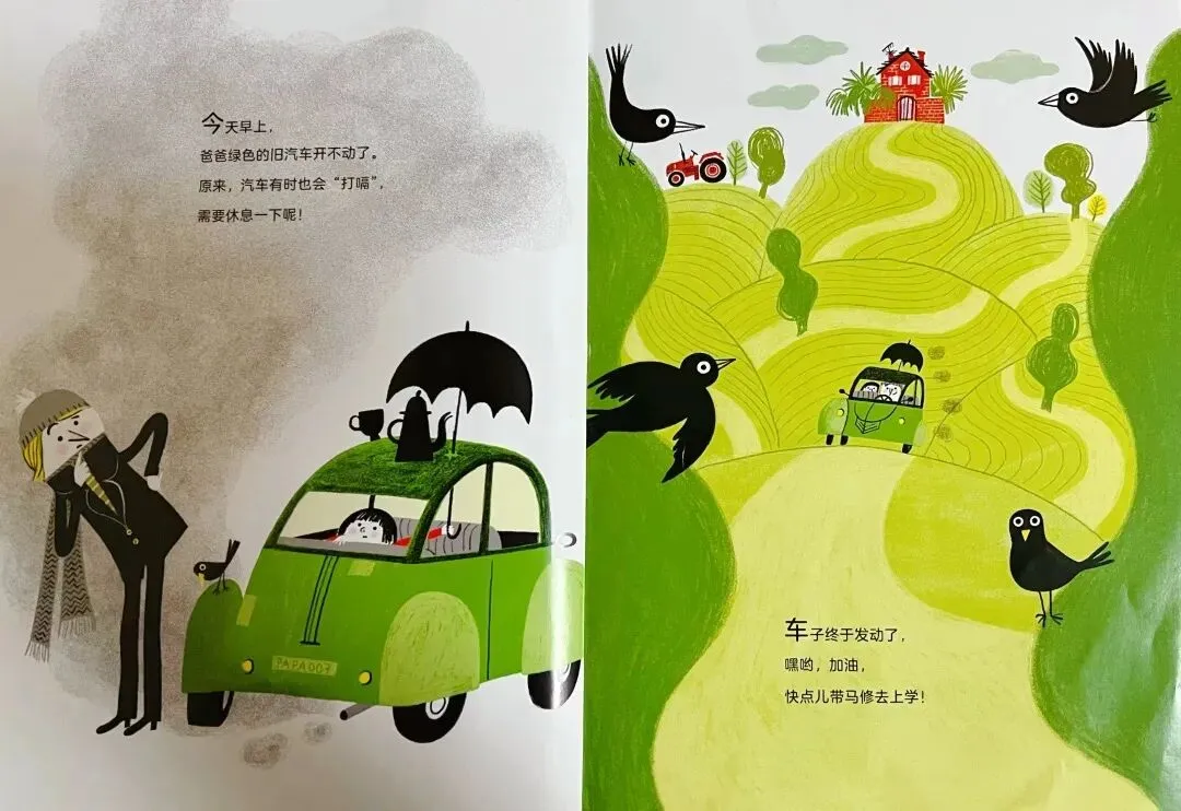 今天早上,爸爸绿色的旧汽车开不动了。原来,汽车有时也会“打嗝”,需要休息一下呢!车子终于发动了,嘿哟,加油,快点儿带马修去上学!