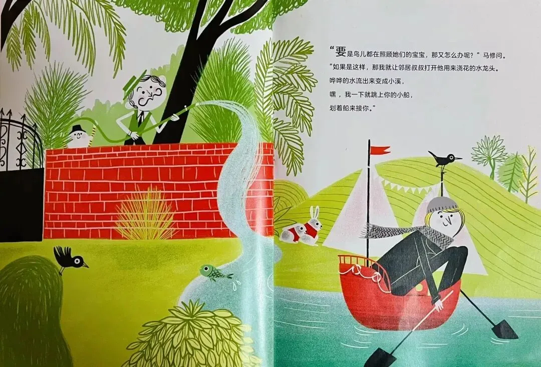 “如果是这样,那我就让邻居叔叔打开他用来浇花的水龙头。哗哗的水流出来变成小溪,嘿,我一下就跳上你的小船,划着船来接你。”