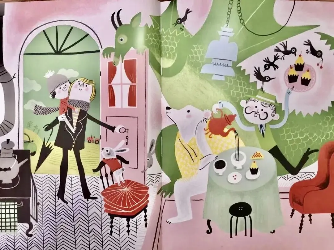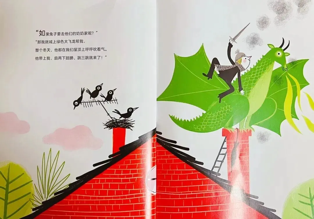 “那我就喊上绿色大飞龙帮我,整个冬天,他都在我们屋顶上呼呼吹着气。他带上我,扇两下翅膀、跳三跳就来了!”