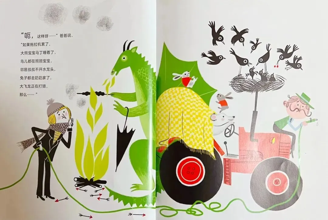 “如果拖拉机累了,大熊宝宝马丁睡着了,鸟儿都在照顾宝宝,邻居叔叔不开水龙头,兔子都去奶奶家了,大飞龙正在打猎,那么……”