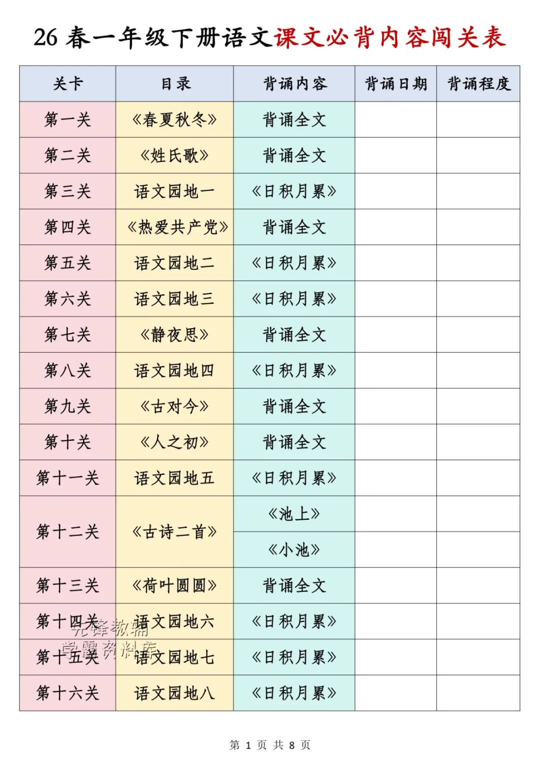 今日分享2026 年春一年级下册语文寒假预习闯关表,电子版可打印。它将全册知识细化为每日小任务,涵盖字词、背诵等。孩子按表闯关,趣味预习,扎实基础,轻松开启新学期语文学习之旅。