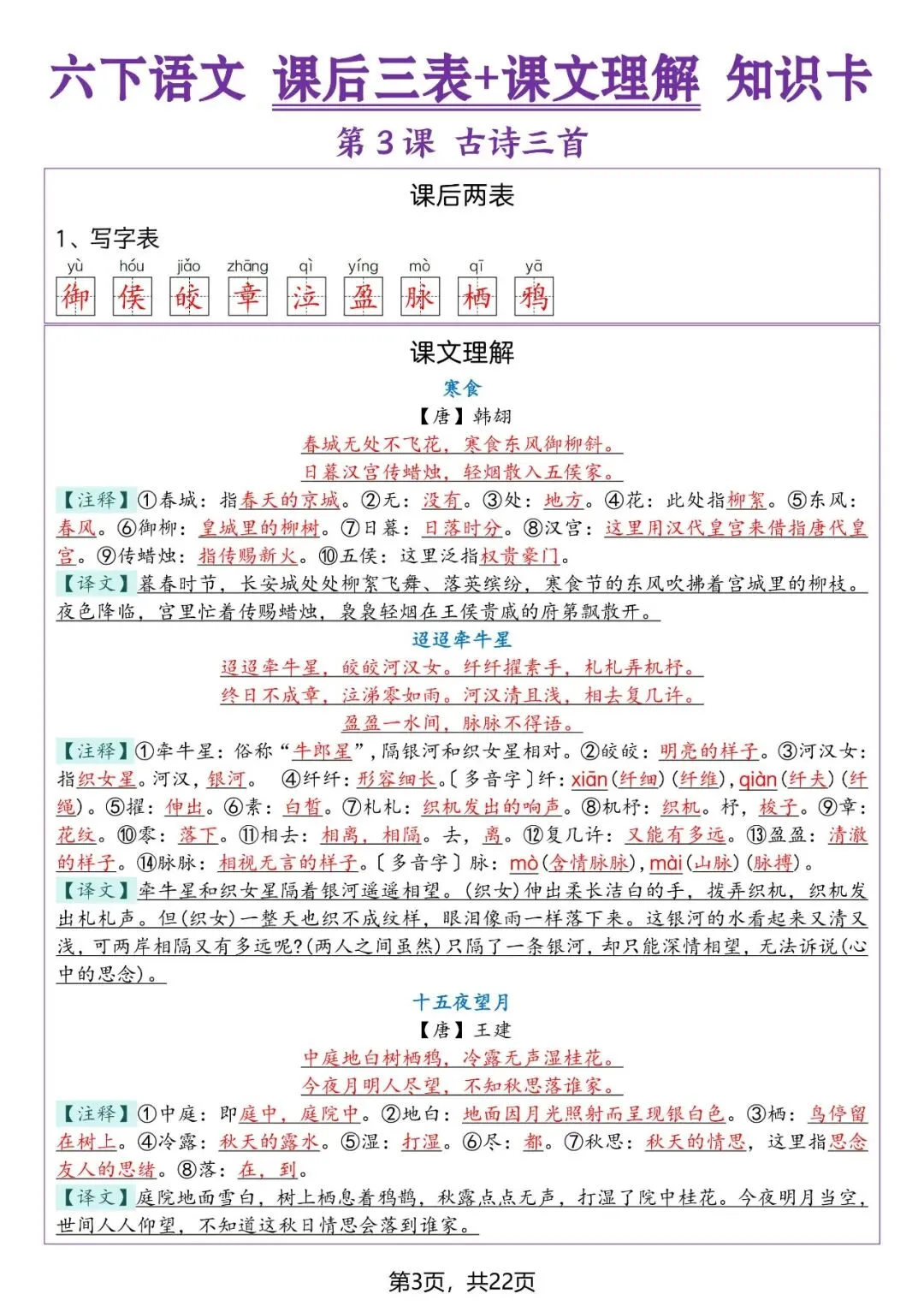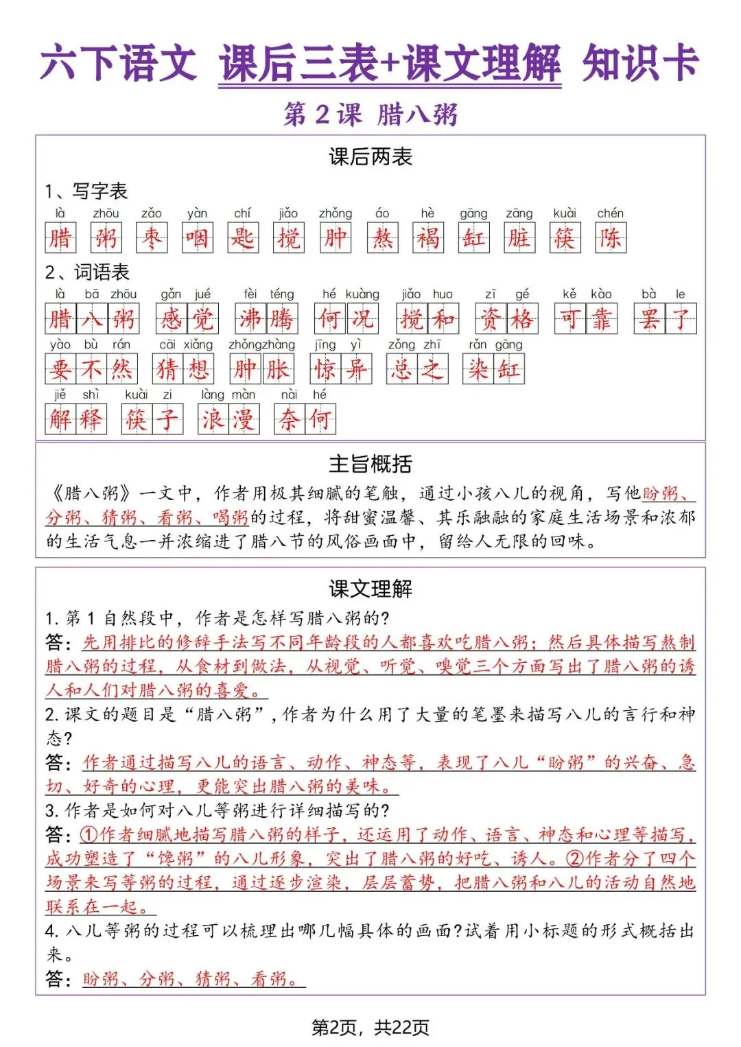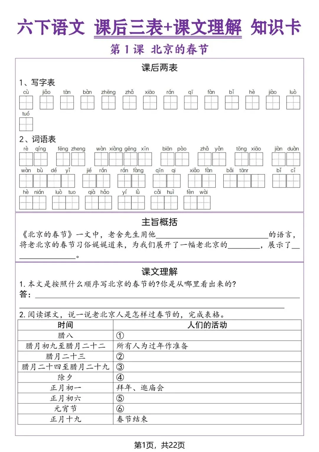 大家好,我是小敏妈妈,今天为大家分享的是;26春人教部编版六年级下册语文《生字表+写字表+词语表》课后三表+课文理解知识卡,高清电子版可打印