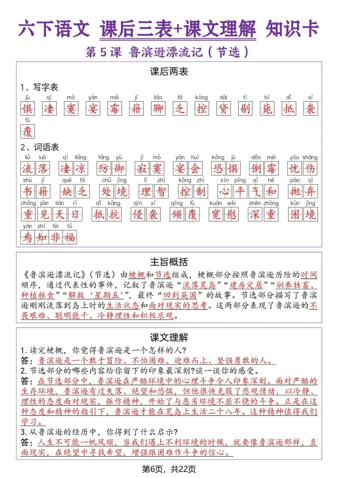 26春人教部编版六年级下册语文《生字表+写字表+词语表》课后三表+课文理解知识卡,高清可打印