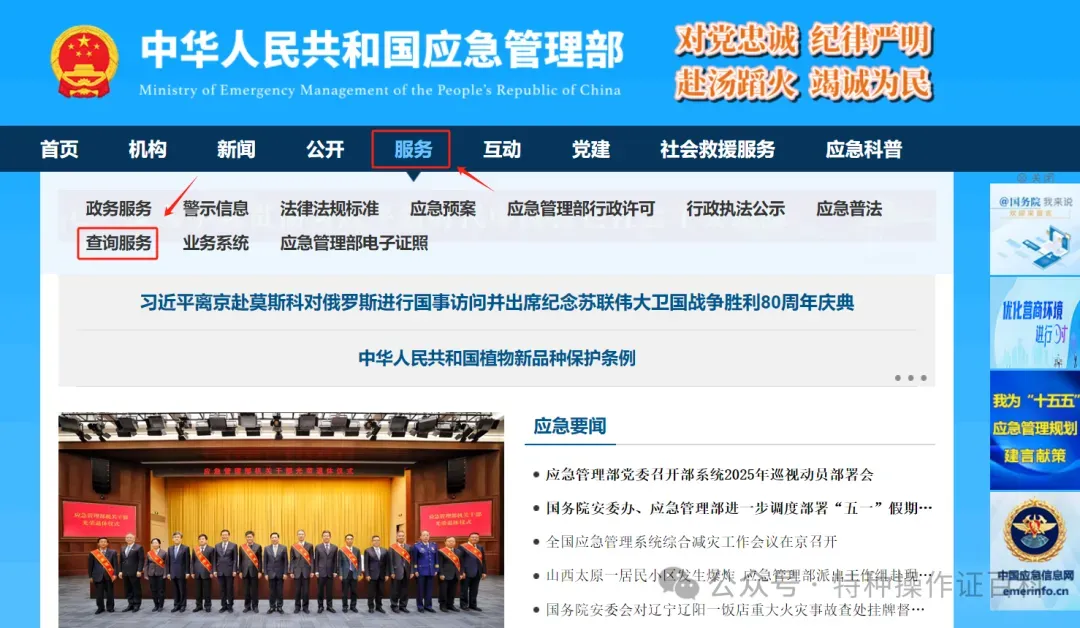 ①进入网站(https://www.mem.gov.cn/),滑动至网页中部查询板块,点击“查询服务”。