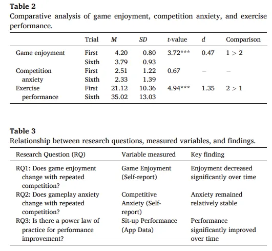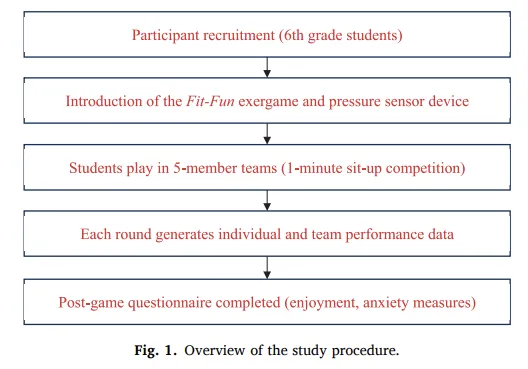 数据收集:每次试验结束后,学生需立刻填写关于“游戏乐趣”和“竞争焦虑”的自评量表 。而“运动表现”(1分钟内完成的仰卧起坐准确次数)则直接由Fit-Fun系统后台客观记录 。使用配对样本t检验和重复测量ANOVA进行时间序列分析 。